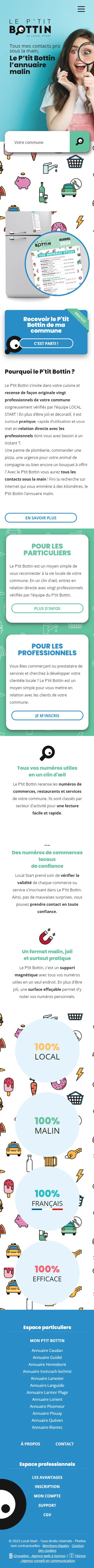 - Charte graphique et expérience utilisateurs : La charte créée par l'agence Ekinox (Arradon, 56) et adaptée au format web par notre équipe design. La qualité de l'expérience utilisateurs a été placée au cœur de nos intentions afin de développer un site qui réponde pleinement aux standards de la navigation sur Internet, tout en exploitant le concept novateur du P'tit Bottin.
