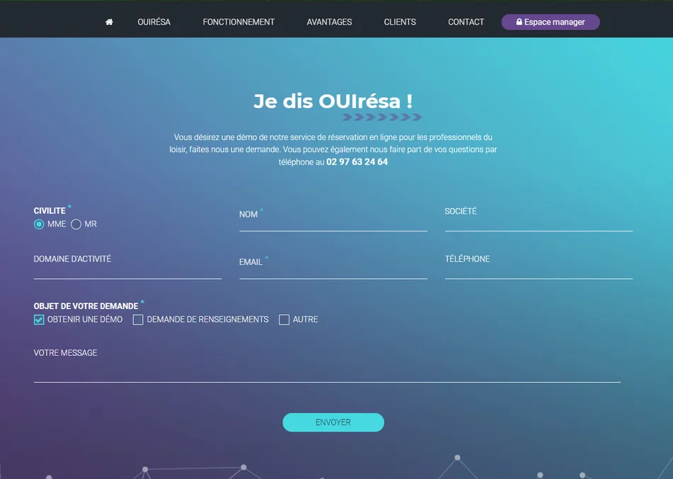 Ouirésa est un outil professionnel de réservation en ligne. Cette plateforme a été développée par notre agence web pour permettre aux professionnels des loisirs de bénéficier d'un outil complet et intuitif. Le site Internet présente un front-office permettant les demandes de devis ou de démonstration. Le back-office est quand à lui dédié aux utilisateurs du système de réservation.