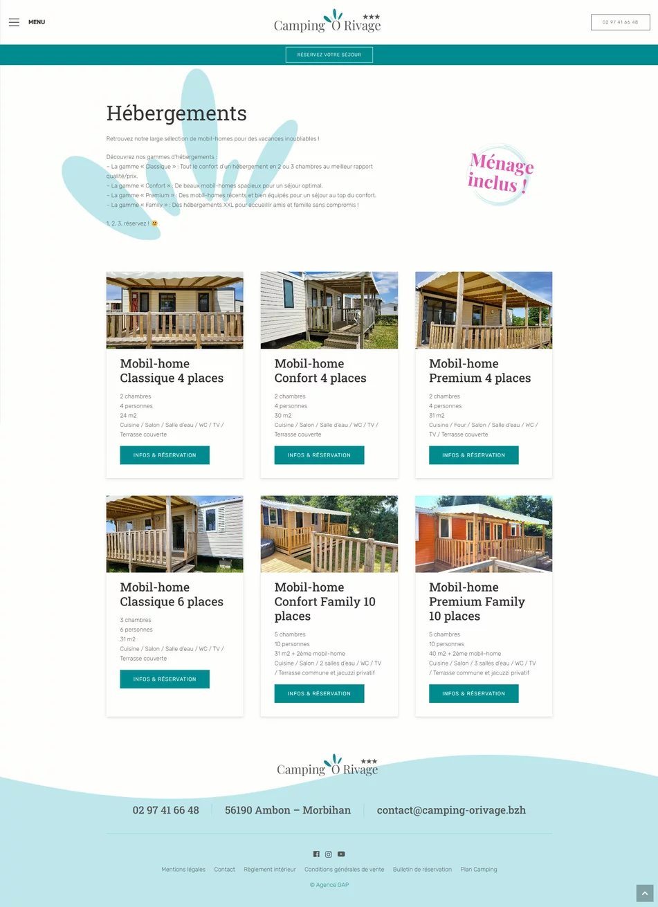 - Système de réservations : Le site embarque un système de réservation en ligne permettant aux internautes de réserver leur mobil-home. Cette solution externe est fournie par eSeason.