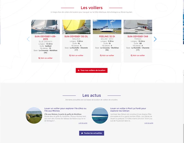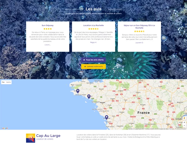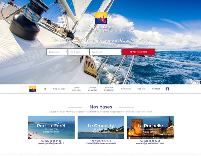 Cap au Large regroupe trois sociétés de location de voiliers en Bretagne (Morbihan et Finistère) et Charente Maritime. Notre agence web a développé ce site qui est le catalogue commun de ces trois sociétés. Une passerelle technique permet aux trois sociétés d'importer leur parc de location depuis leur logiciel CRM sur le site Internet.