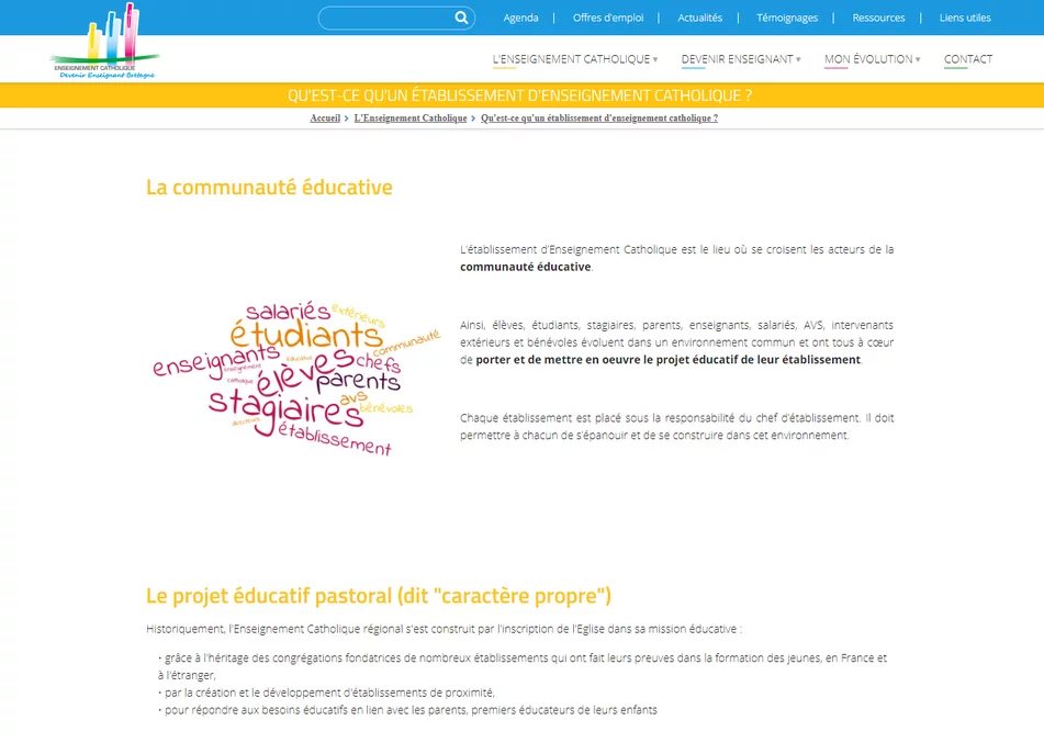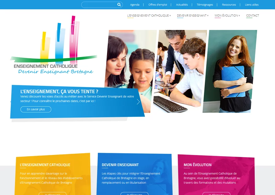 Le site Internet Devenir Enseignant a été créé par notre agence web afin de promouvoir l'enseignement catholique en Bretagne. Ce site regroupe toutes les informations et les documents nécessaire à la compréhension du réseau de l'Enseignement Catholique de l'Ouest pour les futurs enseignants souhaitant postuler. Le site web regroupe de nombreux contenus tels que des témoignages vidéo, des actualités, des documents, des offres d'emploi, ... Ceux-ci sont tous administrables par l'utilisateur.