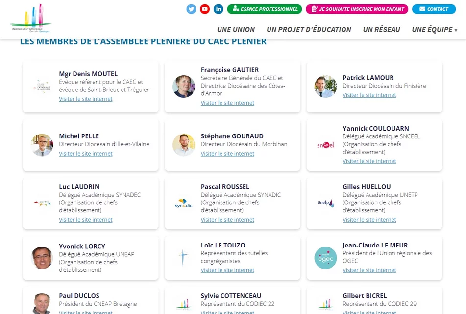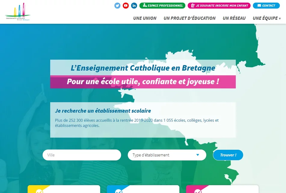 Le site Internet de l'enseignement Catholique en Bretagne a été créé par notre agence web à Vannes afin de promouvoir l'enseignement catholique dans la région Bretonne. Ce site devait être ré-organiser afin de clarifier les informations mises à disposition des internautes. Il regroupe toutes les informations nécessaire à la compréhension du réseau de l'Enseignement Catholique de Bretagne. Plusieurs utilisateurs peuvent administrer le site Internet