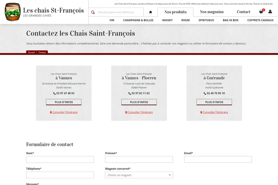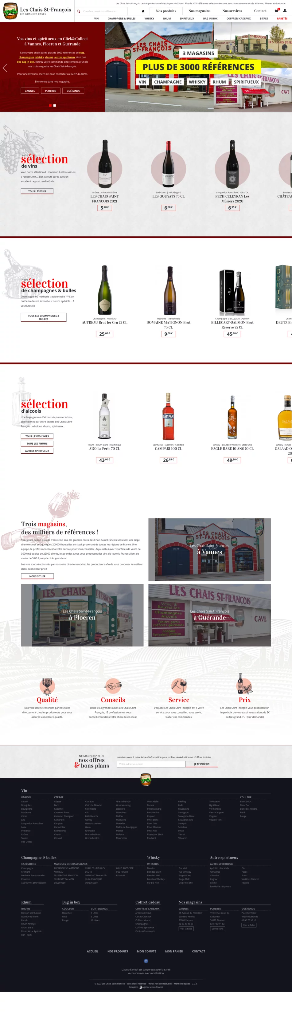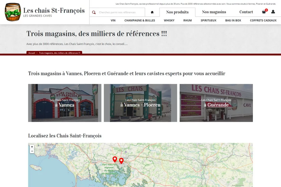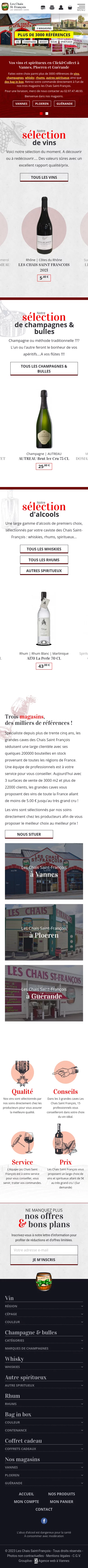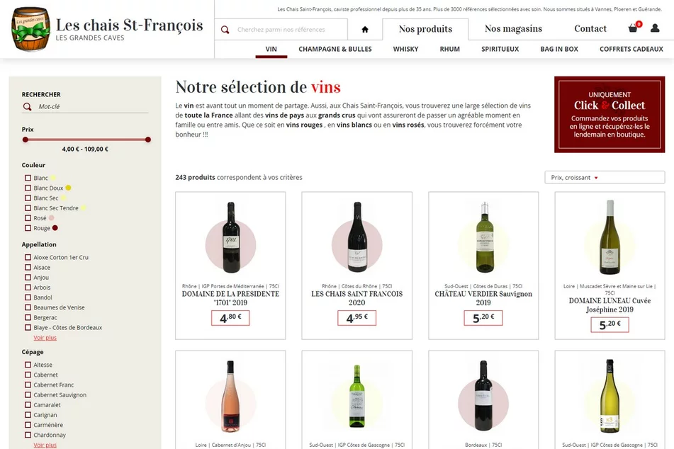 Caviste professionnel depuis plus de 35 ans, Les Chais Saint-François est implanté à Vannes, Ploeren et Guérande. Pour mettre en avant leur catalogue au volume non négligeable (celui-ci comprenant pas moins de 3000 références), notre agence web a développé un site e-commerce exclusivement destiné au Click & Collect. Réalisée avec le CMS Prestashop, la boutique en ligne permet de parcourir facilement le catalogue de produits :