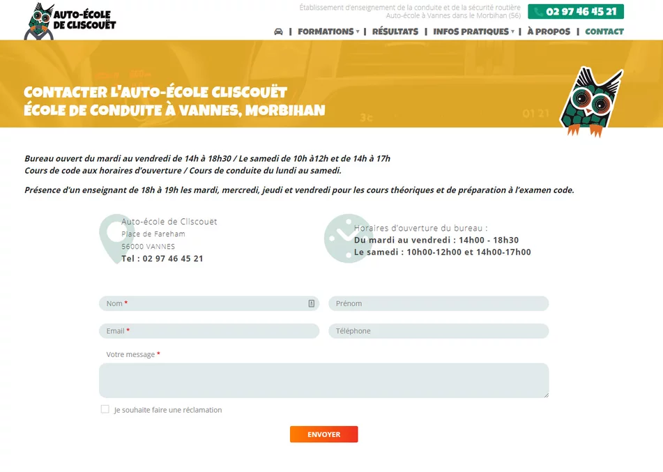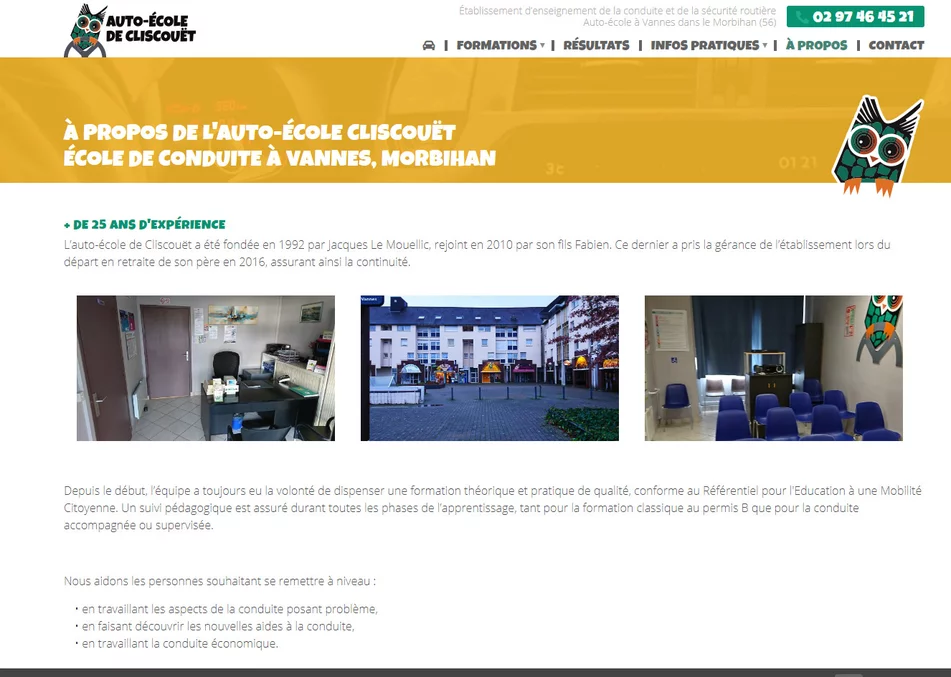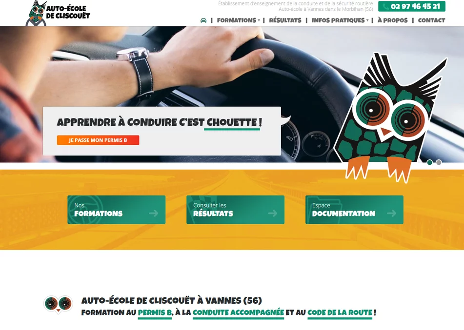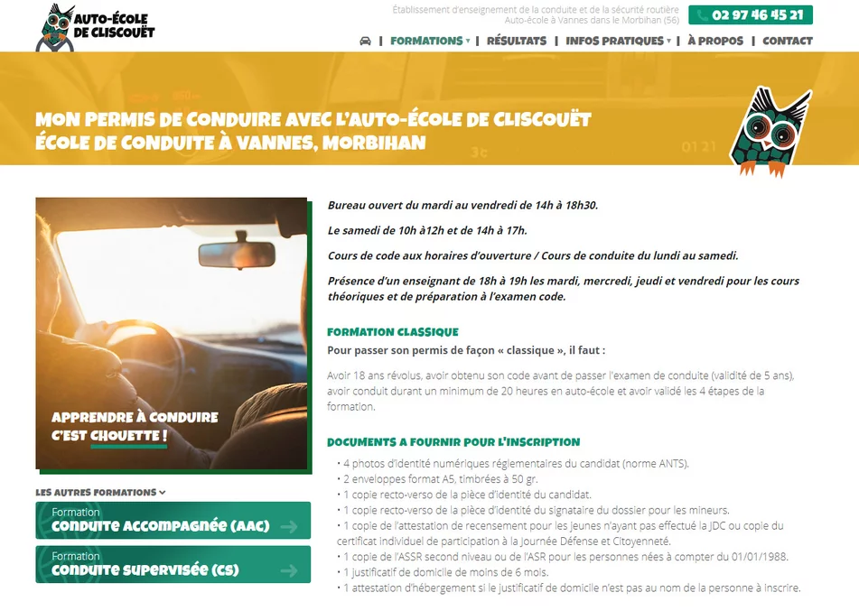 Auto-école de Cliscouët est un organisme de fromation à la conduite basé à Vannes dans le Morbihan. Cette école de conduite a choisi notre agence de création de sites pour faire développer son site internet. Le site Internet permet à l'établissement d'être labellisé et de proposer ainsi des formation spécifiques.