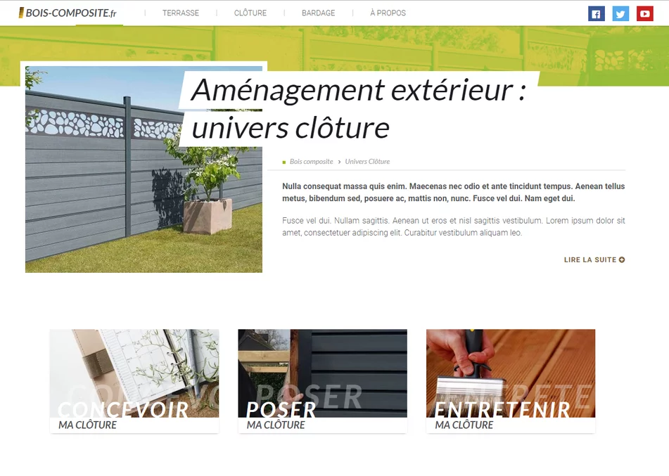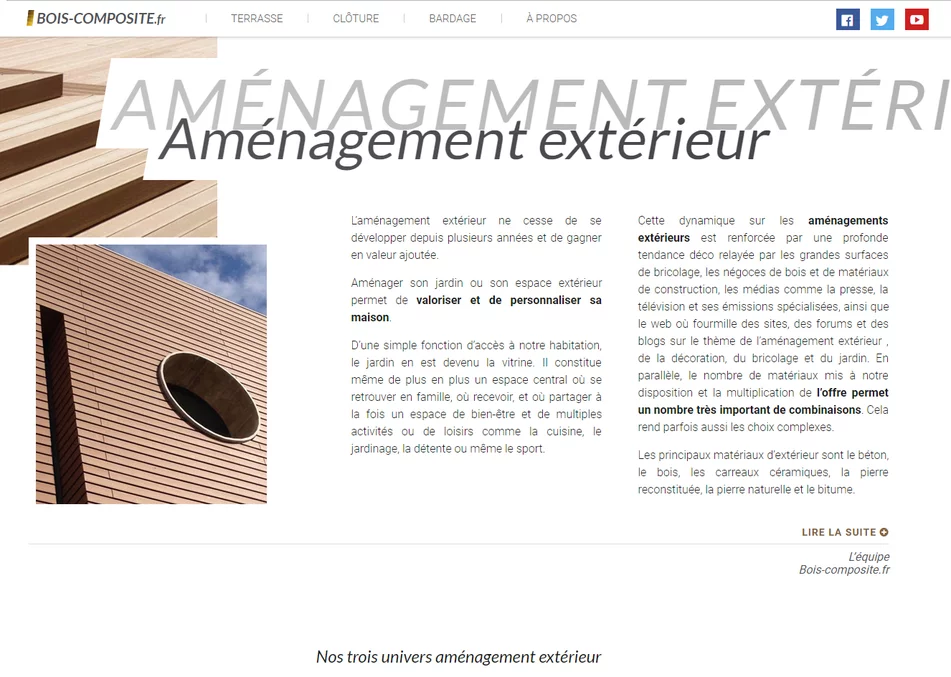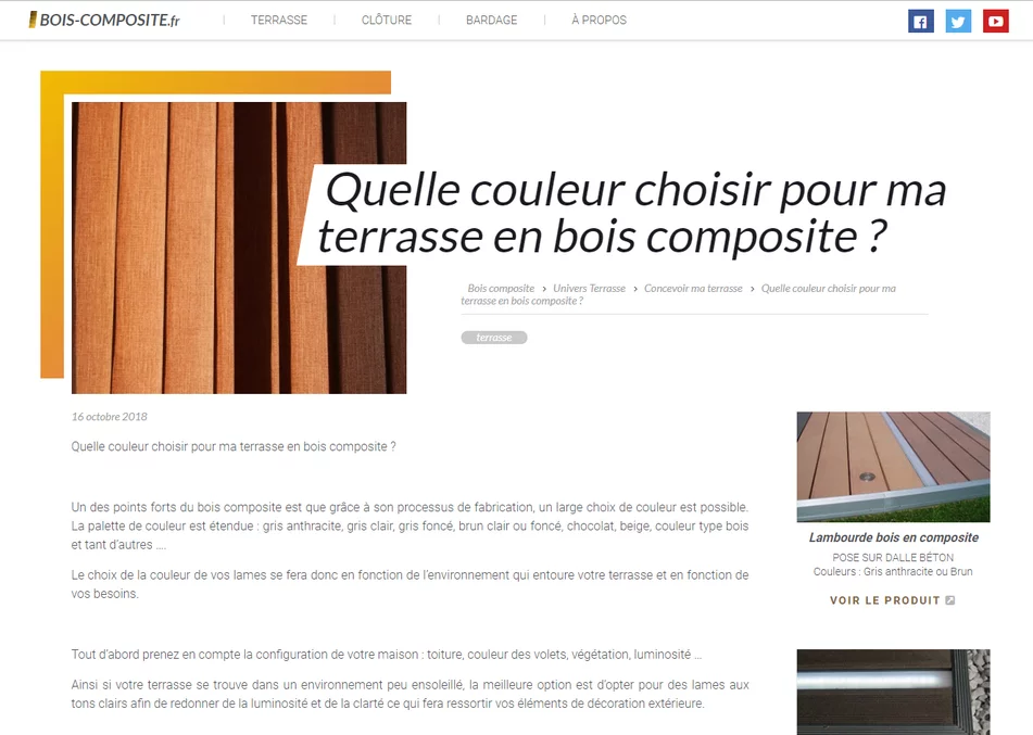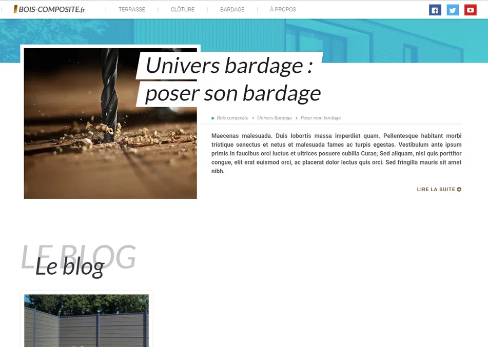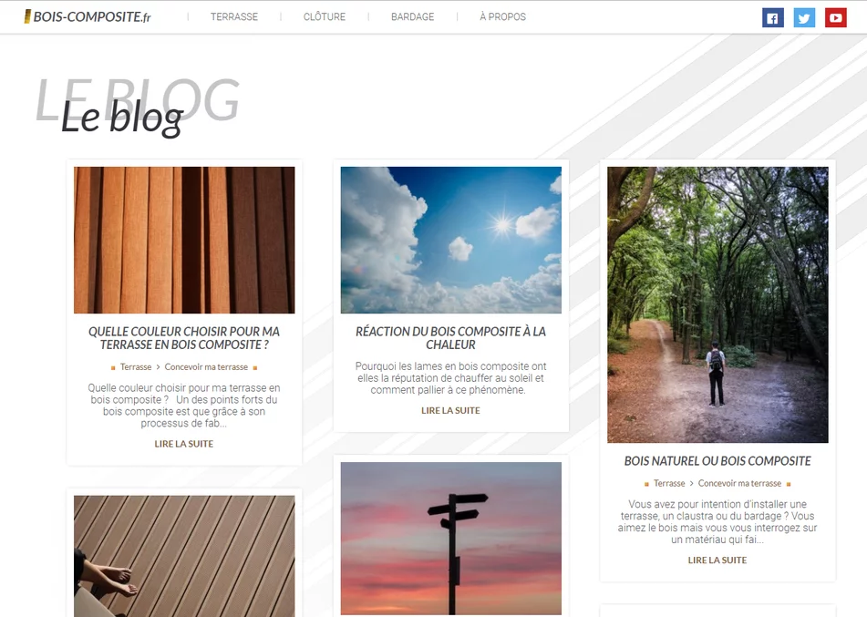 L'agence web vannetaise Grouplive a crée le blog Bois Composite. Ce site Internet permet de consulter l'actualité et des tutos au sujet du bois composite. Notre agence web a développé ce blog en tenant compte de contraintes SEO afin d'optimiser son futur positionnement dans les moteurs de recherche.