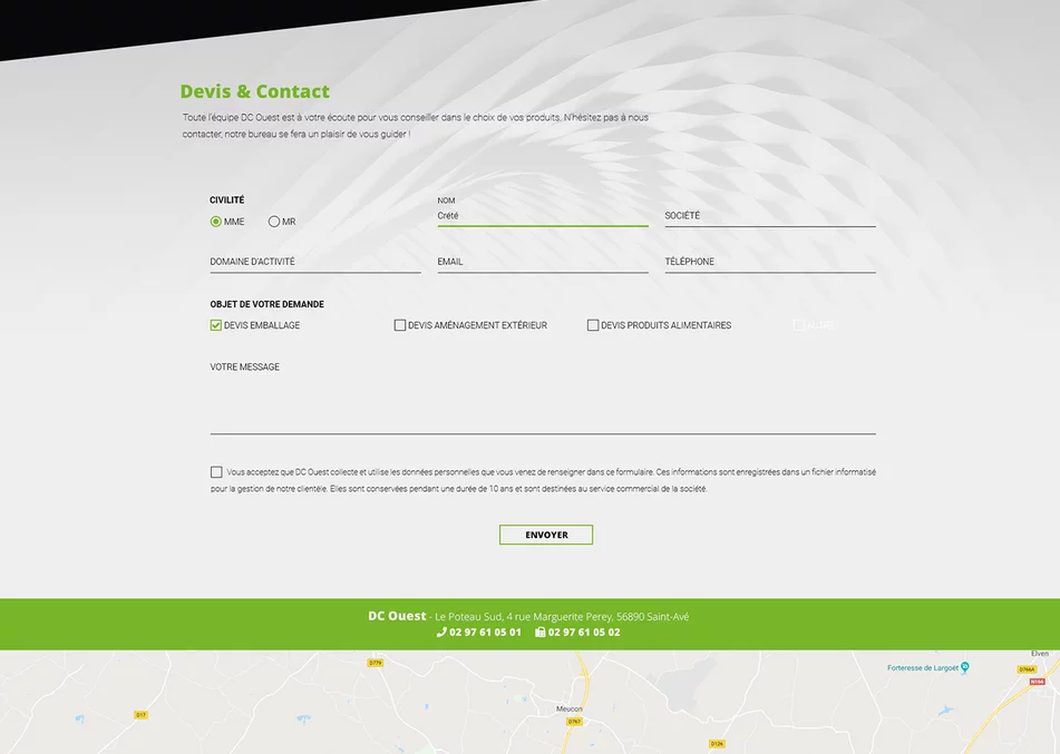 Notre agence web de création de sites Internet à Vannes et Lorient a développé le site Internet vitrine de DC Ouest, agence commerciale implantée à Vannes dans le Morbihan. Ce site Internet vitrine dont le design est "One page" (le contenu site web tient sur la seule page d'accueil) permet aux internautes de se renseigner sur les prestations proposées par DC Ouest. Un formulaire permet de faire une demande de devis en ligne.