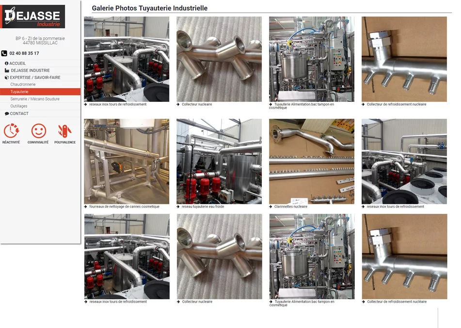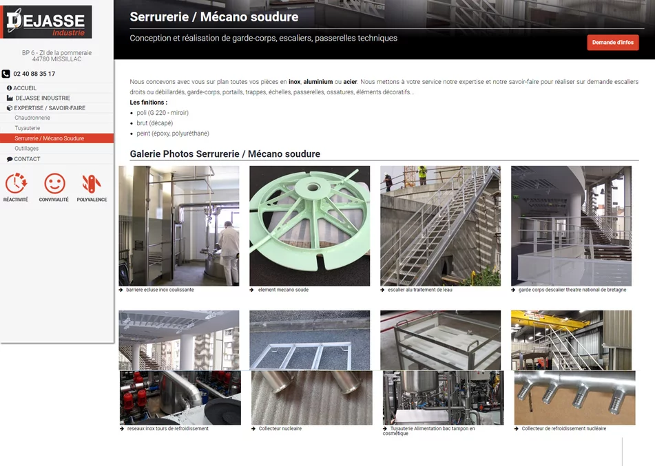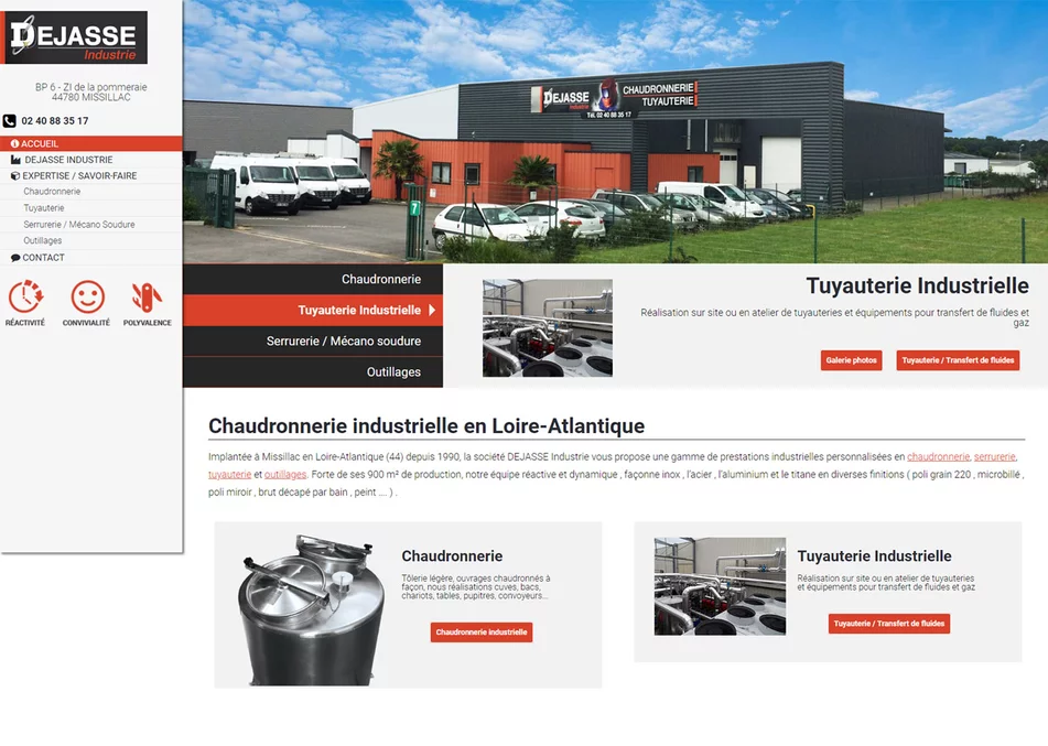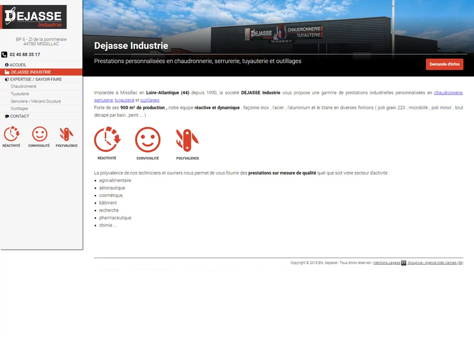 Notre agence de création de sites Internet à Vannes et Lorient a développé le site web de Dejasse Industrie. Il présente les activités de la société de chaudronnerie. La charte graphique a été respectée afin que le site web soit à l'image des documents déjà édités par la société (plaquette, flyer...