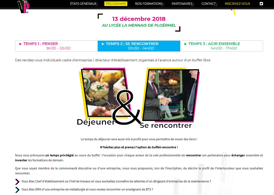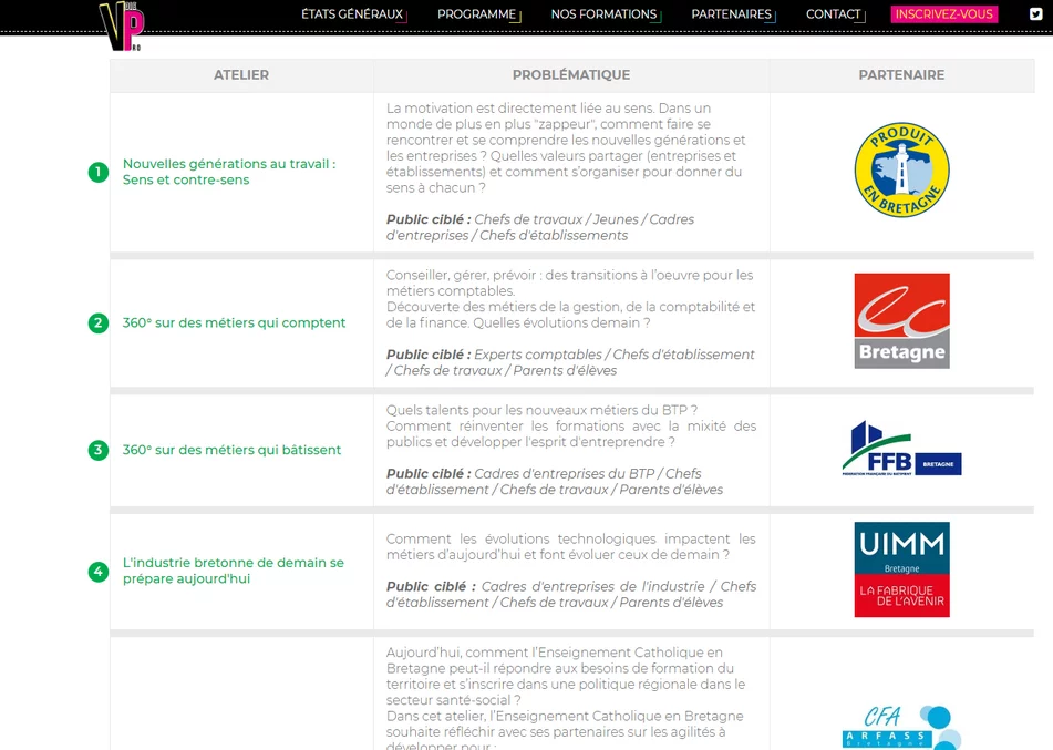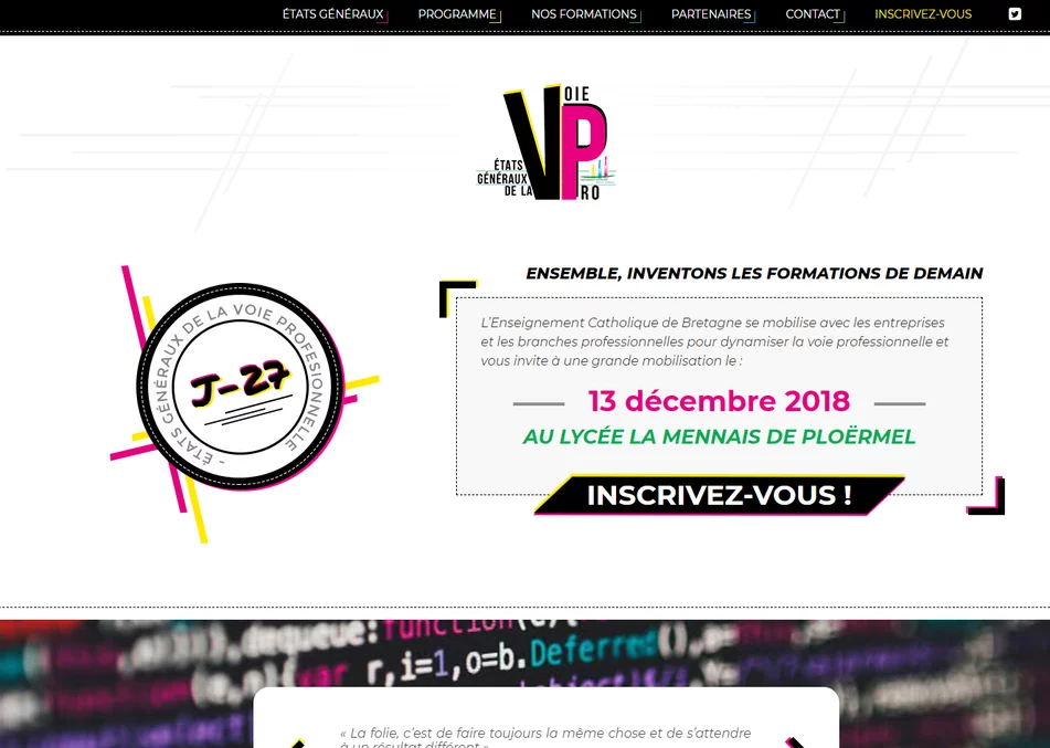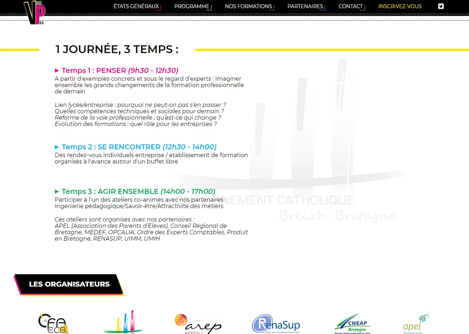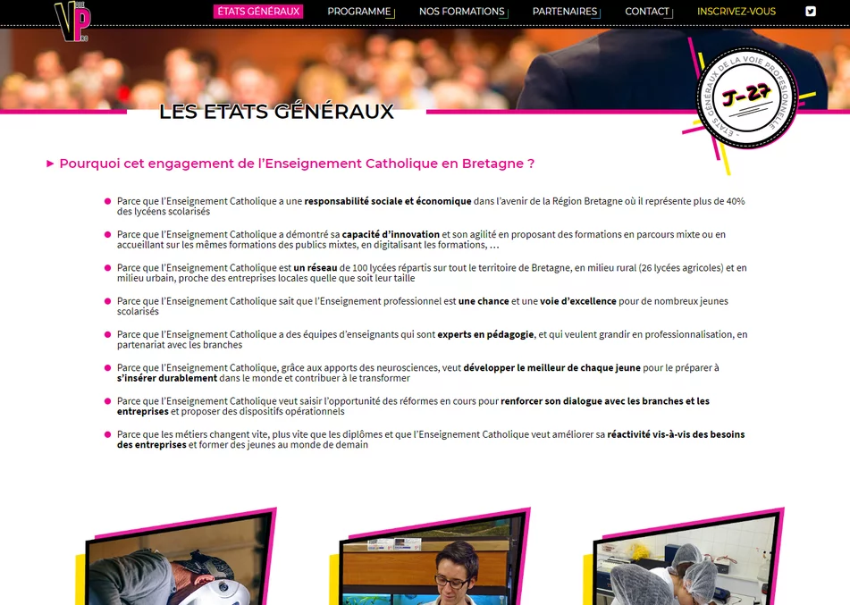 Notre agence web de création de sites web à Vannes a créé le site Internet des États généraux de la Voie Professionnelle. Un site pour informer les internautes au sujet de cet événement qui s'est déroulé courant décembre 2018. Notre agence travaille sur plusieurs projets avec la Direction Départementale de l'Enseignement Catholique (DDEC).