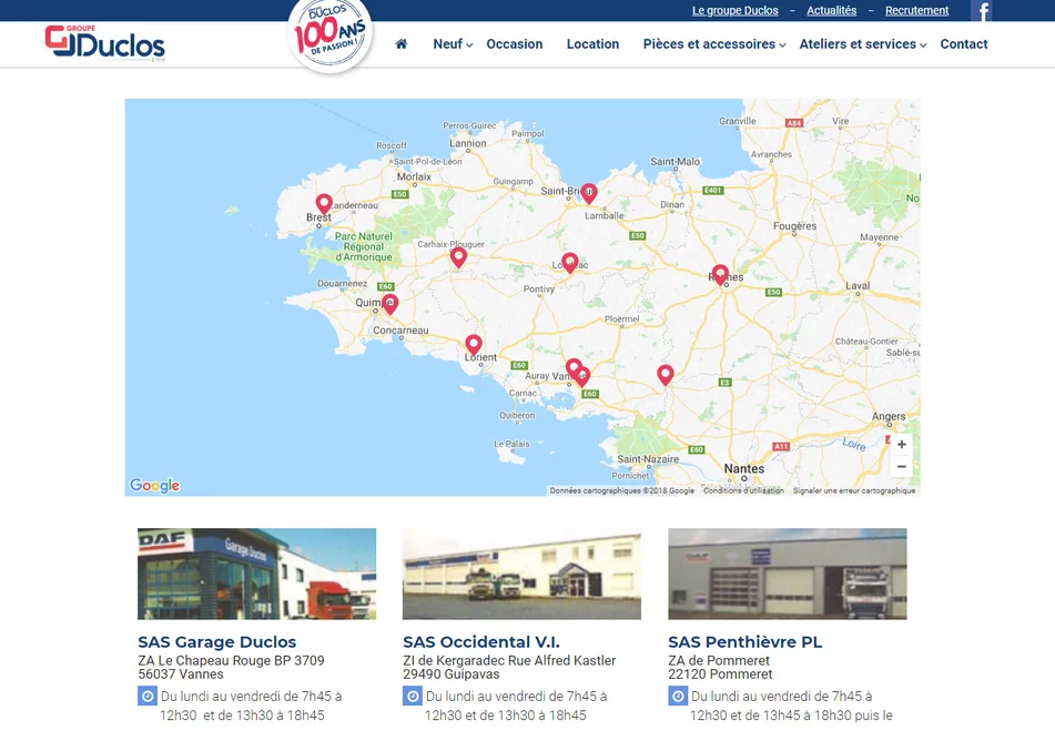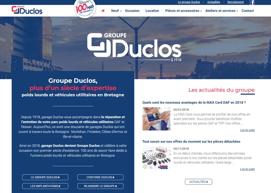 À l'occasion des 100 ans du garage Duclos à Vannes, le Groupe Duclos a décidé de faire appel à notre agence pour revoir sa communication sur Internet. Ce projet nous a amené dans un premier temps à retravailler l'identité visuelle du groupe. Dans ce contexte, nous avons créé le nouveau logo qui est maintenant utilisé pour l'ensemble des établissements du groupe.