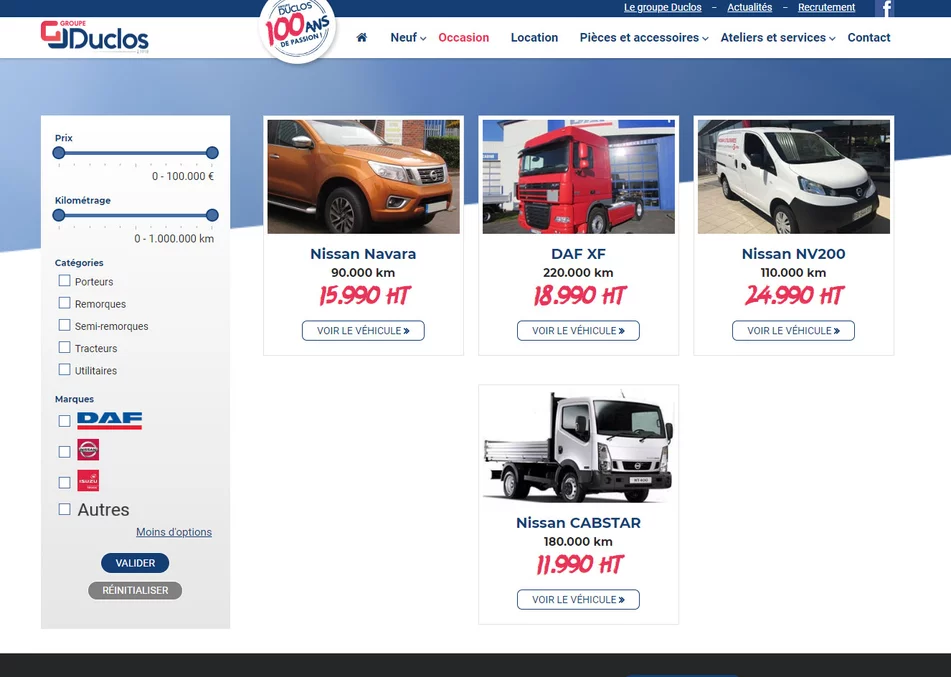 Dans un second temps, nous avons pris en charge la réalisation du site Internet : webdesign, intégration, développement et hébergement. Il présente l'activité et les services du Groupe Duclos ainsi que les véhicules neufs et occasion vendus dans les concessions qui peuvent être réservés via le site.