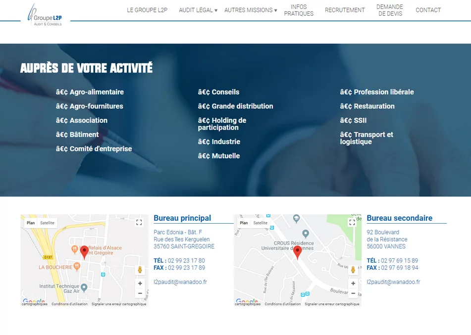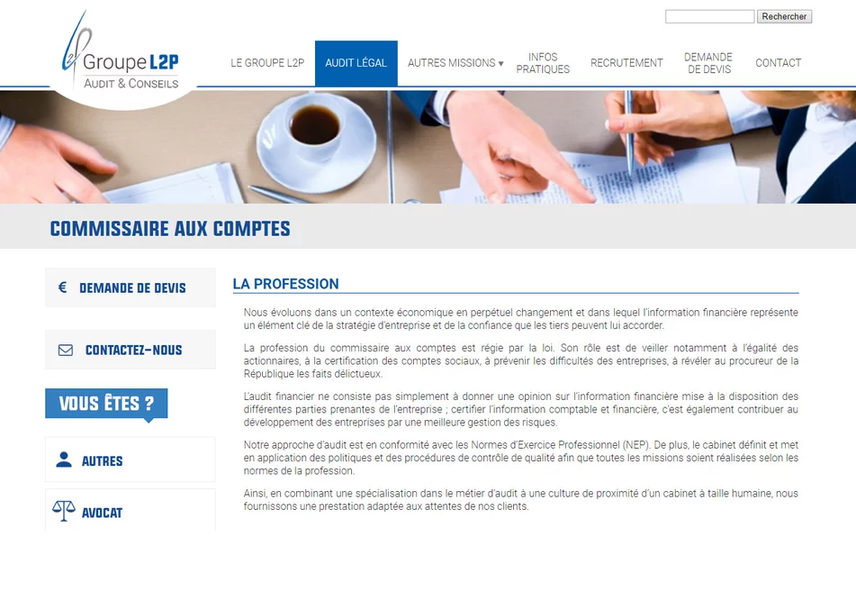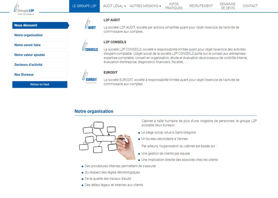 L2P est un cabinet d'audit et conseil basé à Vannes dans le Morbihan (56) et à Rennes (35). Le cabinet a fait appel à notre agence web pour créer son site Internet afin de présenter ses différentes missions.