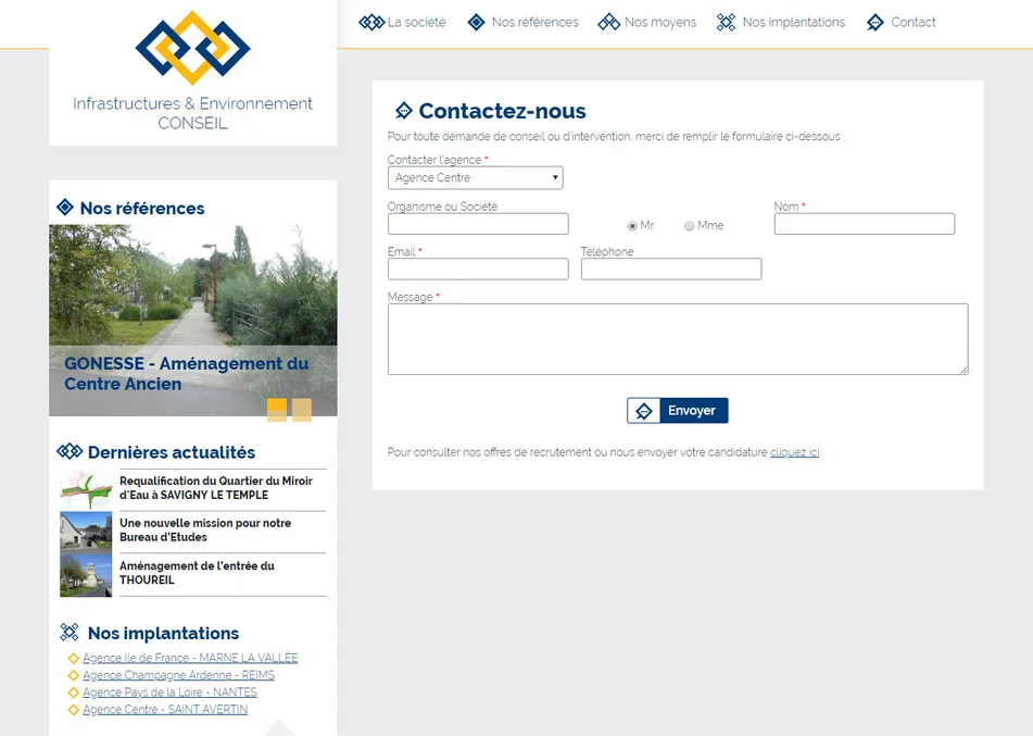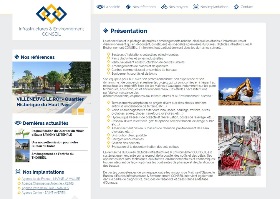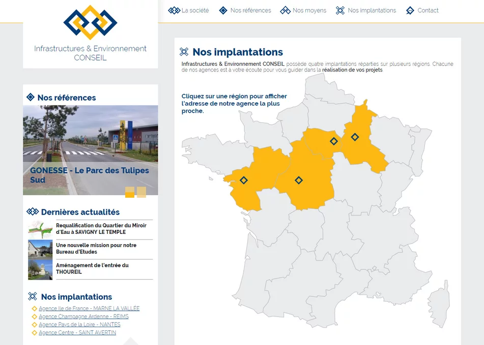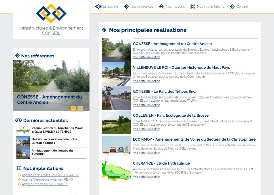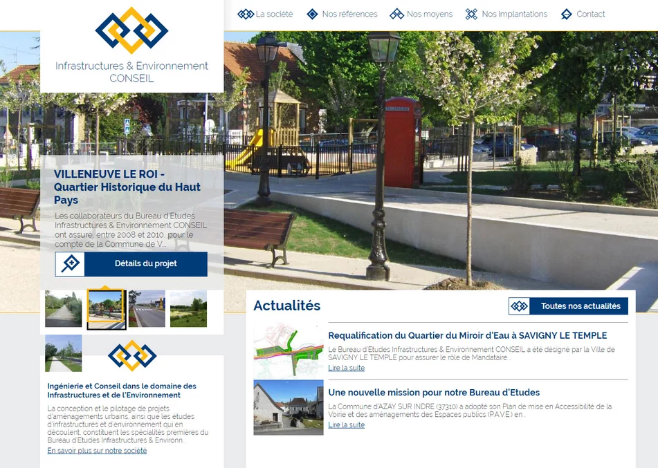 Infrastructures & Environnement CONSEIL est un bureau d'étude dont le siège est situé à Marne-La-Vallée. Cette société à rayonnement national est chargée de la conception et la réalisation de projets urbains. Système d'actualités Gestion des références de la société Carte interactiv...