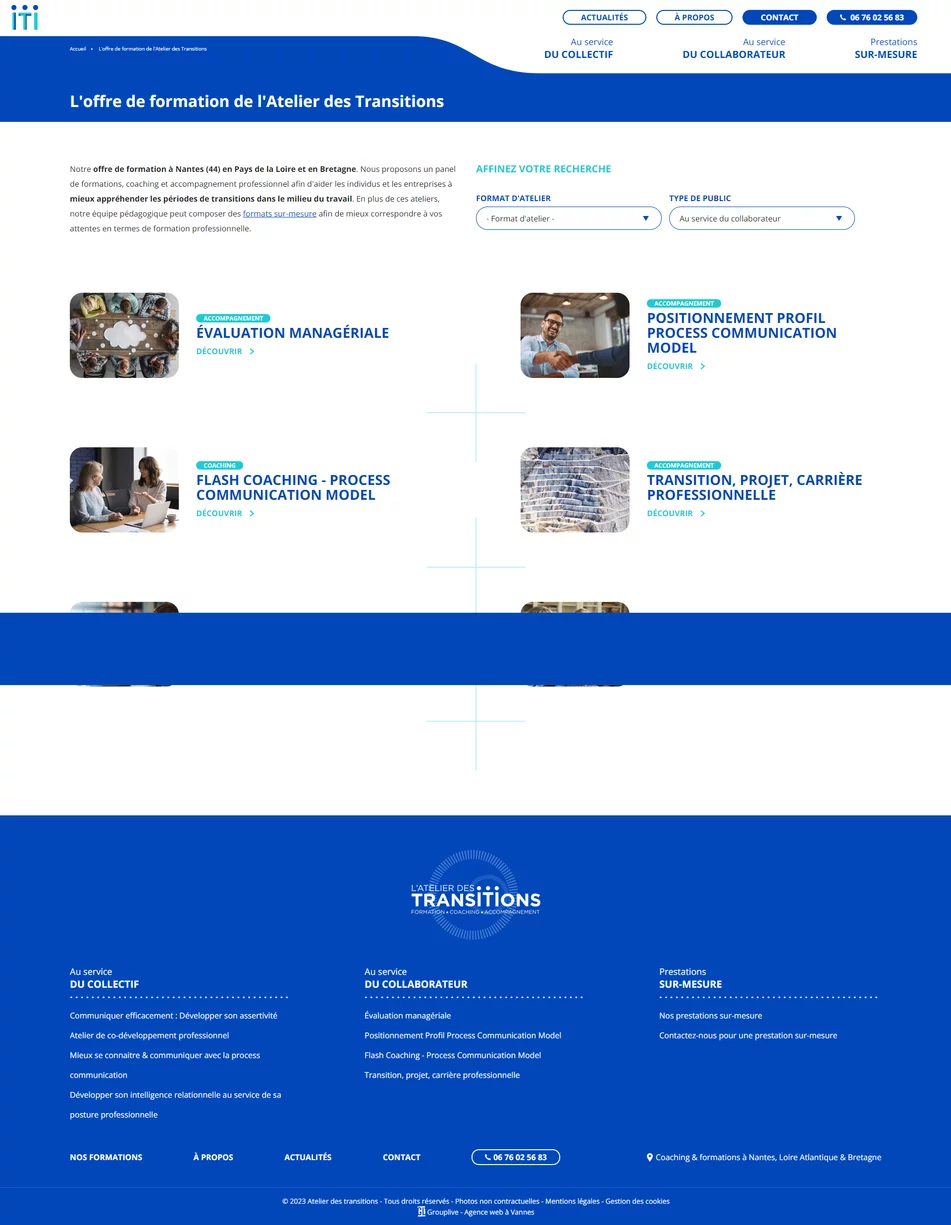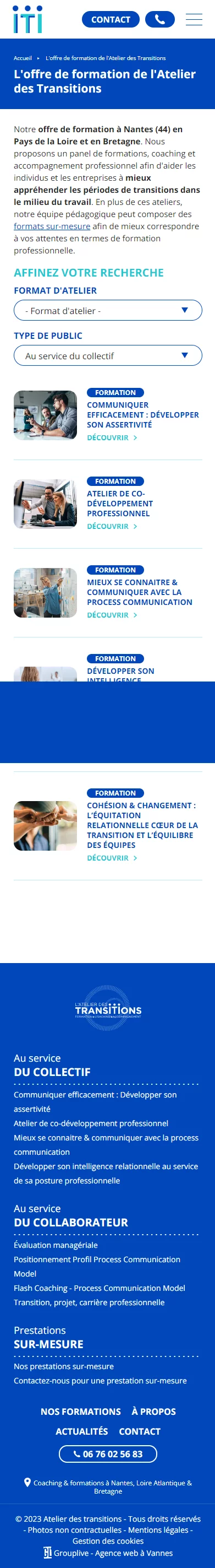 En combinant ces caractéristiques, le site web de "L'Atelier des Transitions" offre une expérience utilisateur exceptionnelle tout en renforçant la crédibilité de l'institution en tant que prestataire de formation en management à Nantes. C'est un exemple éloquent du travail méticuleux de Grouplive dans la création de sites web sur mesure et performants.