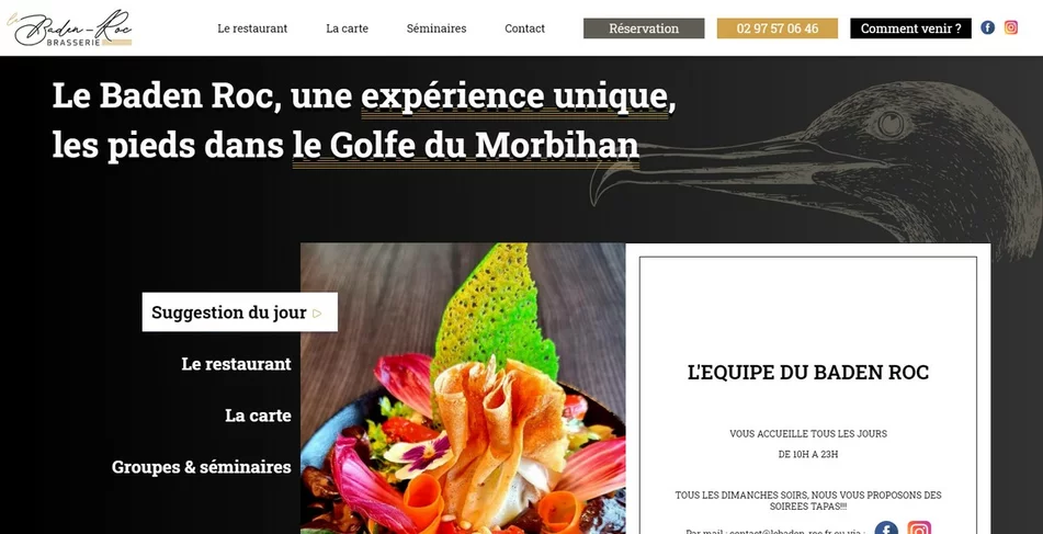 Le Baden Roc est un restaurant situé à l'embarcadère du Port Blanc à Baden. Renommée pour son panorama, la terrasse du restaurant offre en effet une vue époustouflante sur le Golfe du Morbihan. Nous avons tenu à mettre en avant ce cadre hors-du-commun en concevant leur site vitrine, d'où l'idée d'accueillir le visiteur avec un slider pleine page.