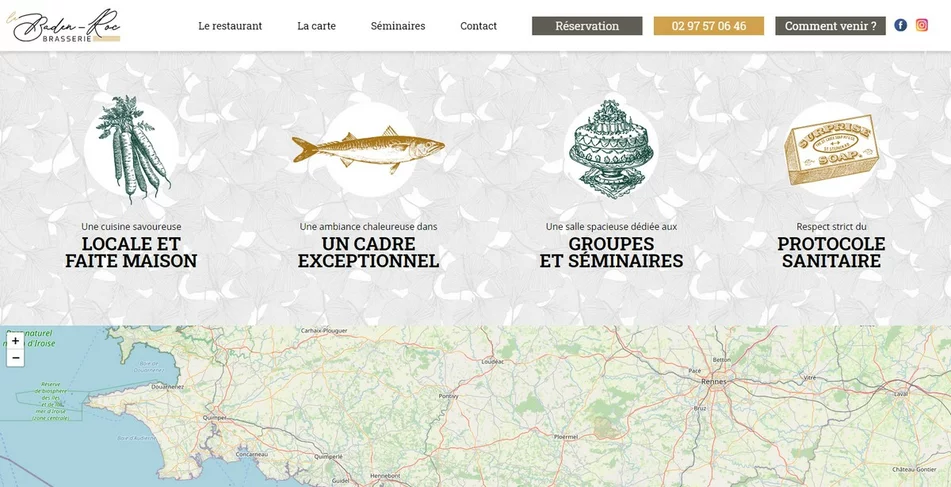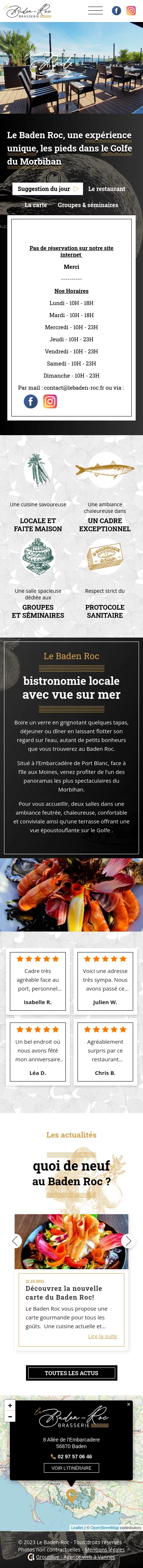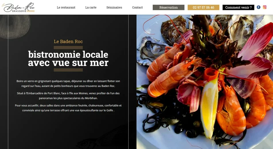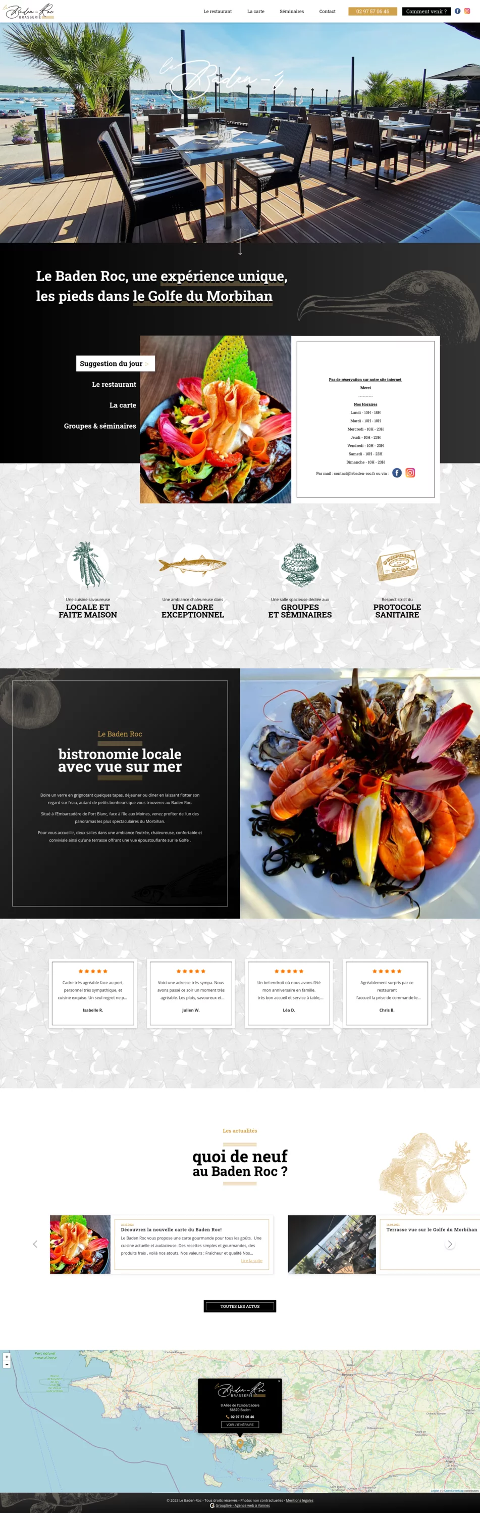 Le Baden Roc est un restaurant situé à l'embarcadère du Port Blanc à Baden. Renommée pour son panorama, la terrasse du restaurant offre en effet une vue époustouflante sur le Golfe du Morbihan. Nous avons tenu à mettre en avant ce cadre hors-du-commun en concevant leur site vitrine, d'où l'i...