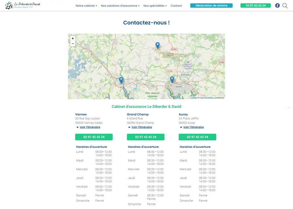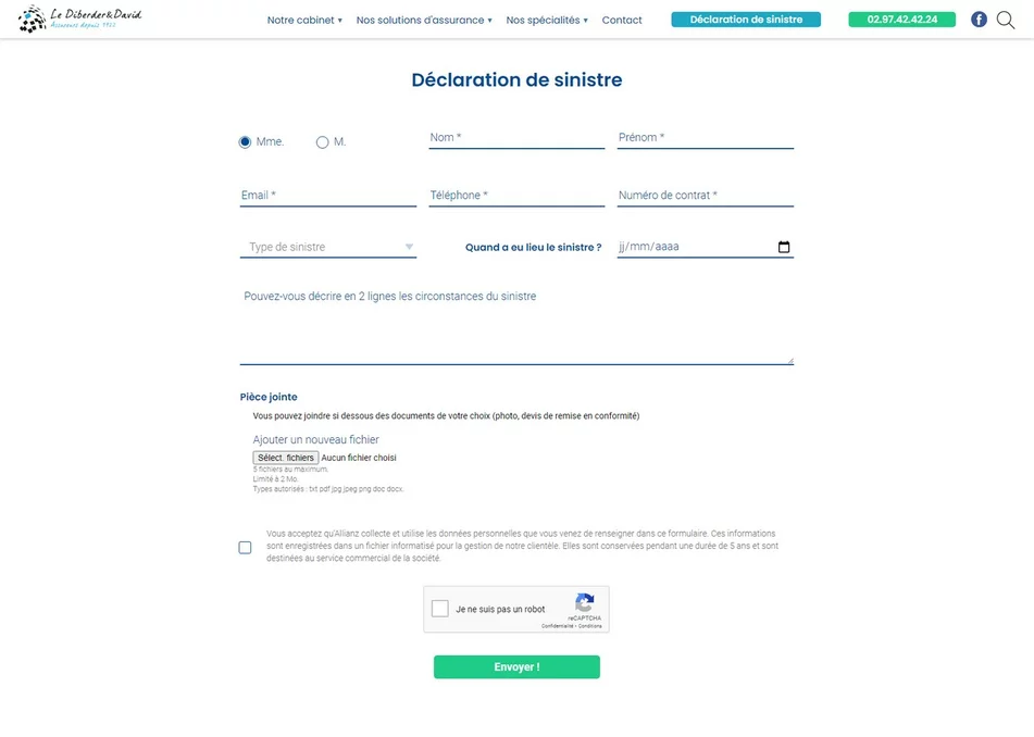 Un formulaire de contact facilite le contact avec le cabinet afin d'obtenir d'avantage d'informations voire un devis. Concernant les assurés, ils peuvent utiliser le site afin de déclarer un sinistre grâce à un second formulaire spécialement conçu à cet effet.