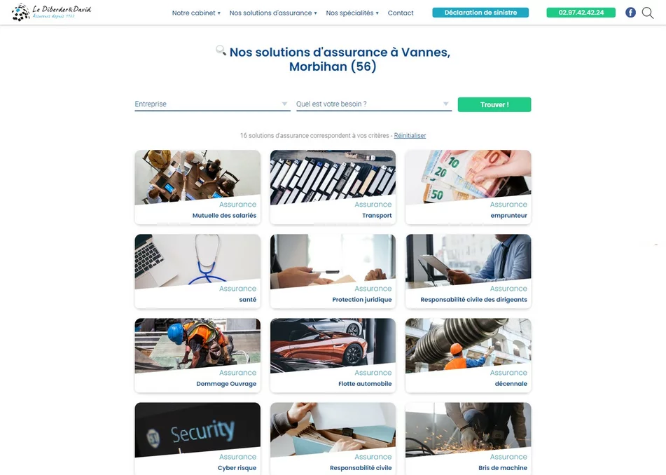 Une section du site est dédiée aux solutions d'assurance disponibles ; celles-ci se divisent en deux catégories (Particulier et Entreprise) et plusieurs sous-catégories. Un filtre composés de deux champs interdépendants permet donc de sélectionner facilement le cas de figure qui nous intéresse.
