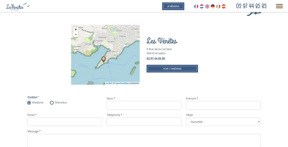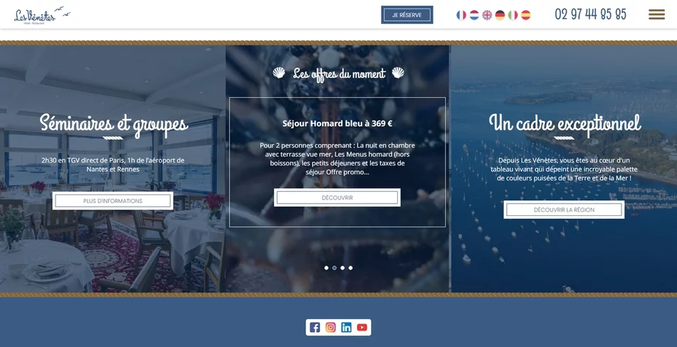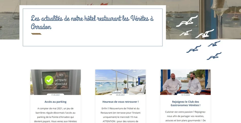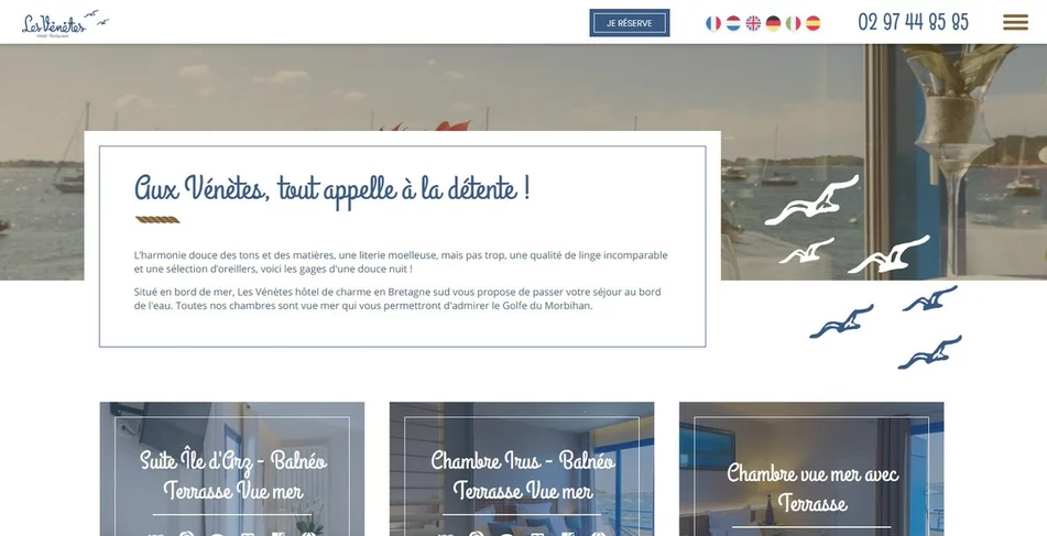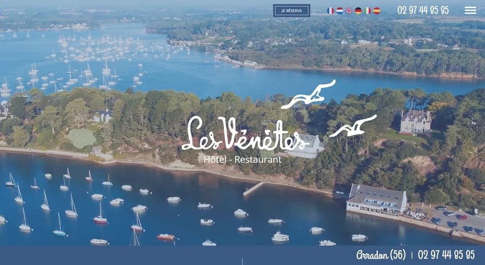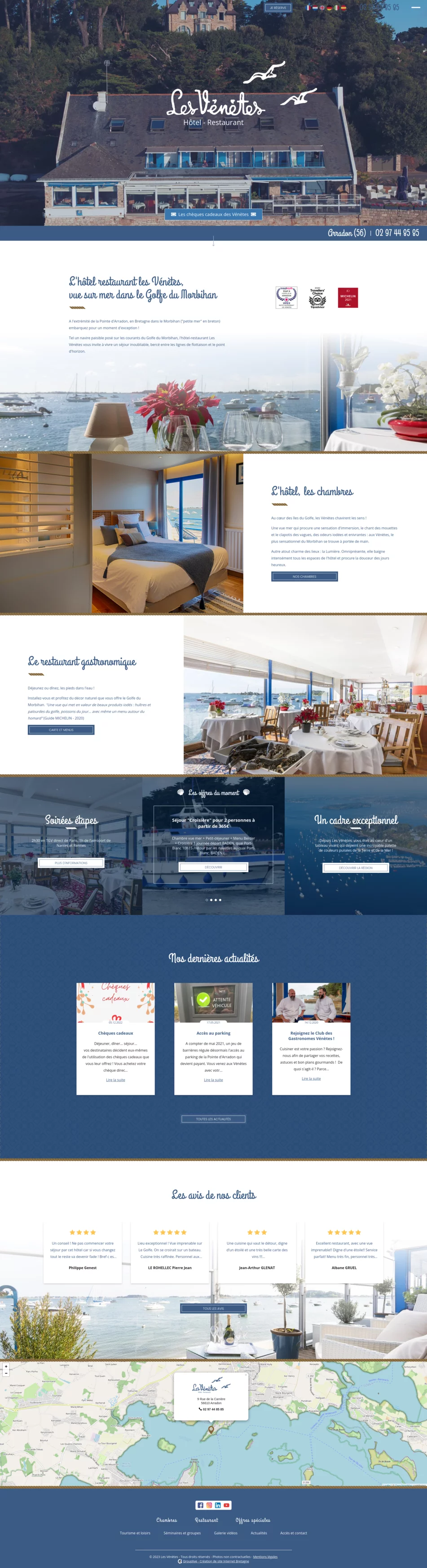 Les Vénètes, établissement hôtelier faisant également office de restaurant, ont fait appel aux services de notre agence web pour la refonte de leur site vitrine. Réalisé à l'aide du CMS Drupal, ce site web présente l'hôtel- restaurant en détail : les chambres, la carte et ses menus, les offres du moment. Le cadre unique des lieux est également mis en avant grâce à une section listant les sites remarquables des environs ainsi qu'une galerie de vidéos mettant en valeur la beauté de la pointe d'Arradon.