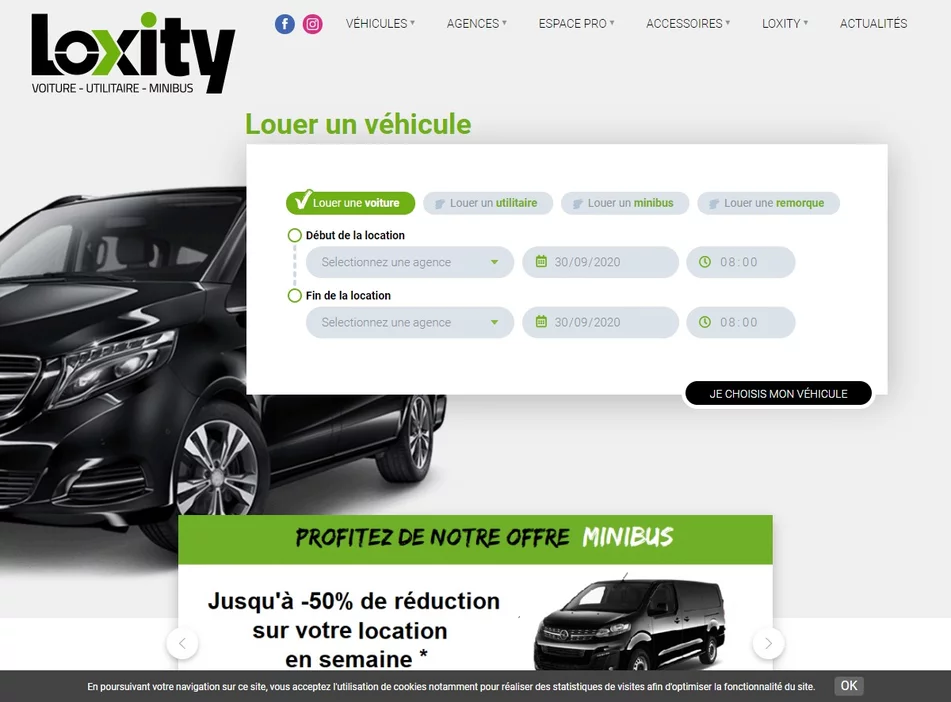 Mis en place par notre agence web, ce site vitrine présente les trois agences de location ainsi que leur offre de services. Pour les besoins de Loxity, nous avons développé un moteur de recherche complexe permettant de rechercher un véhicule en fonction de différents critères (type de véhicule, agence de location, dates). Nous avons également implémenté un formulaire de demande de devis dont les champs peuvent, selon le cas de figure, être préremplis avec les informations soumises lors de la recherche.