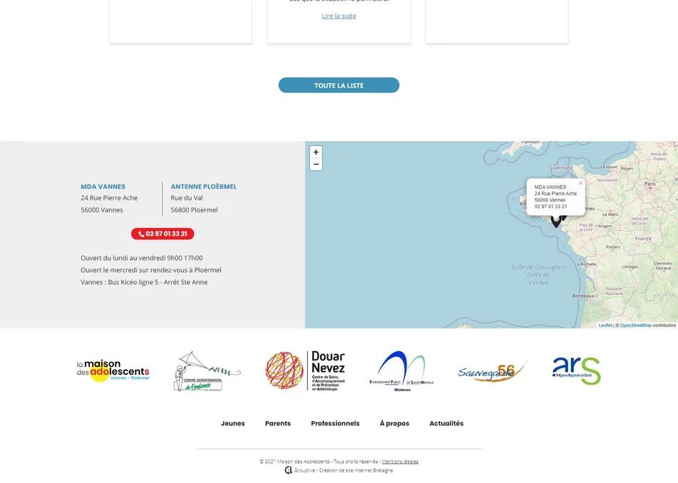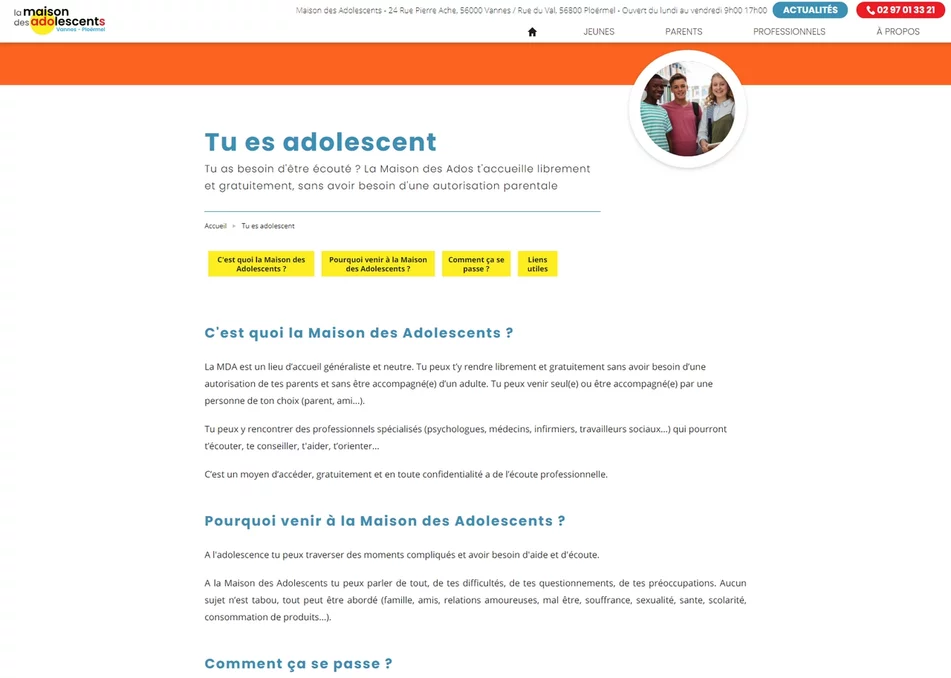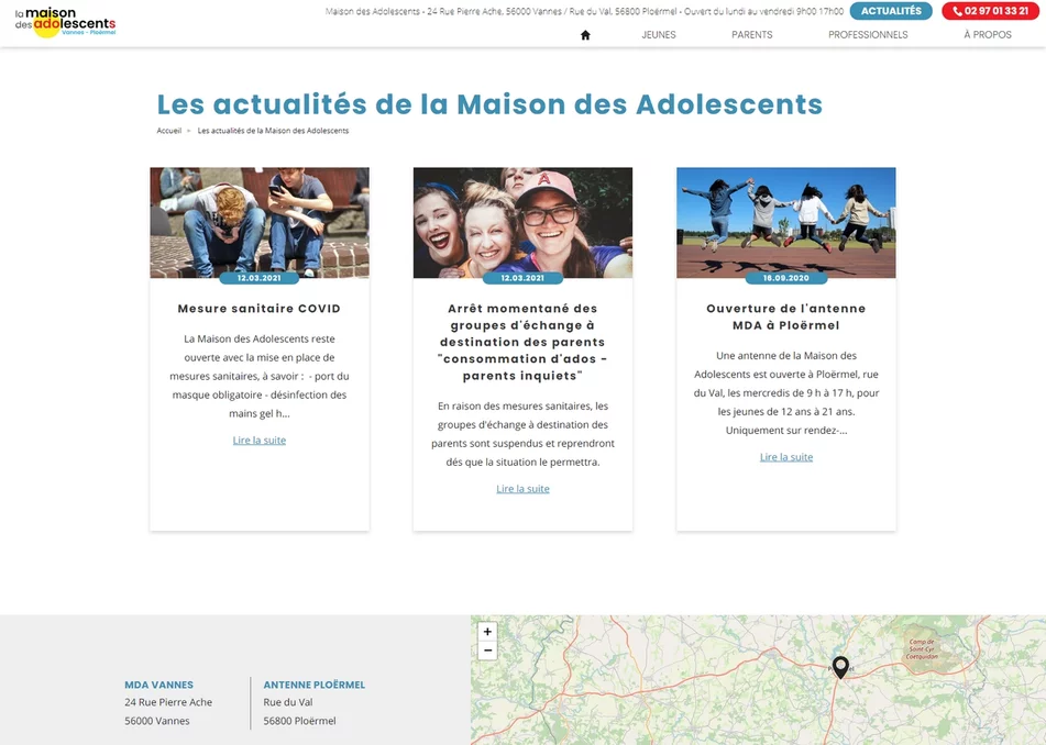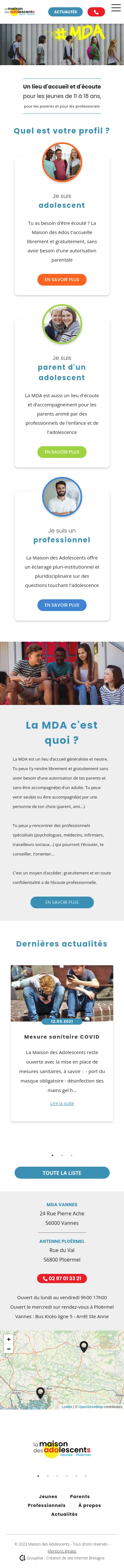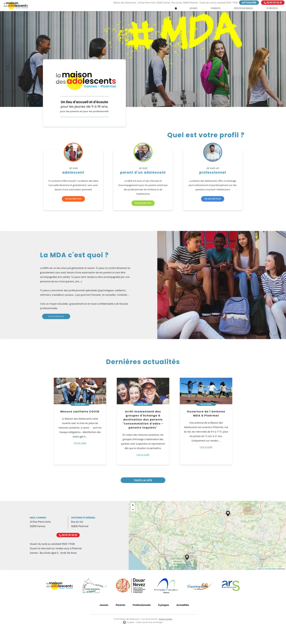 La Maison des Adolescents de Vannes nous a fait confiance pour la création de leur site internet. Ce site vitrine permet de présenter ce lieu d'accueil à destination des adolescents mais aussi de leurs parents quand le besoin ou l'envie s'en fait ressentir. Les professionnels de l'adolescence, qu'ils soient enseignants, travailleurs sociaux ou psychologues, peuvent également solliciter les services de la MDA afin d'obtenir des informations ou encore organiser des rencontres et des actions de prévention.