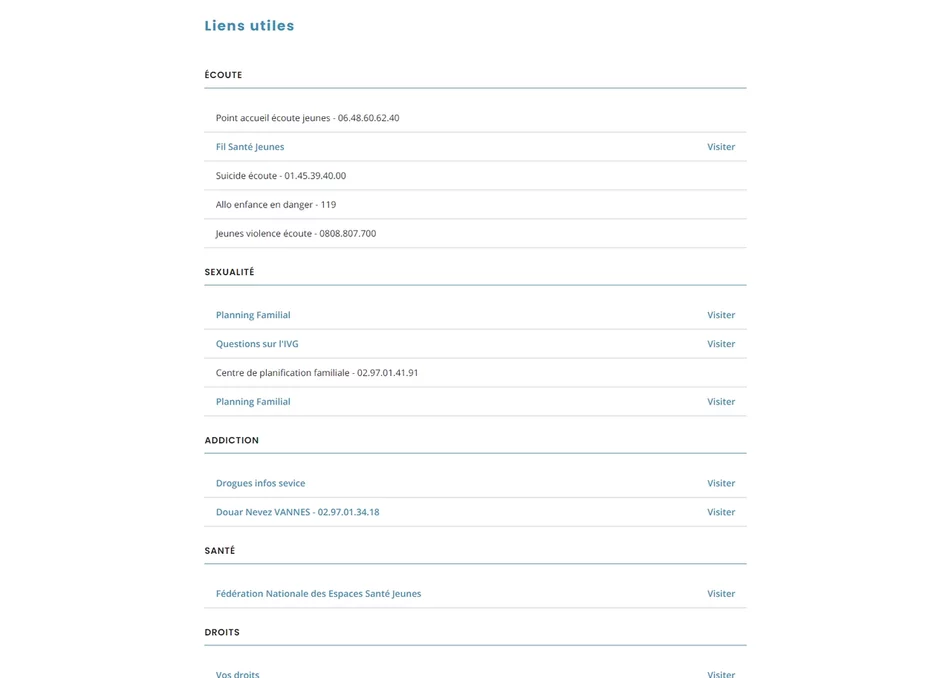 Pour les besoins de la Maison des Adolescents, notre agence web a conçu un système d'annuaire qui permet aux administrateurs d'intégrer facilement des liens en fonction d'une catégorie précise. Le format de ces contenus facilite le parcours de navigation de l'internaute en attirant son attention sur les ressources susceptibles de l'intéresser.