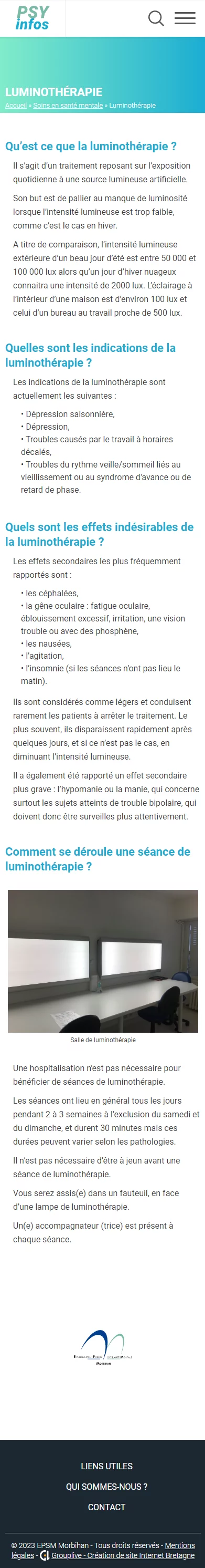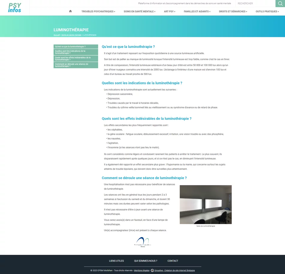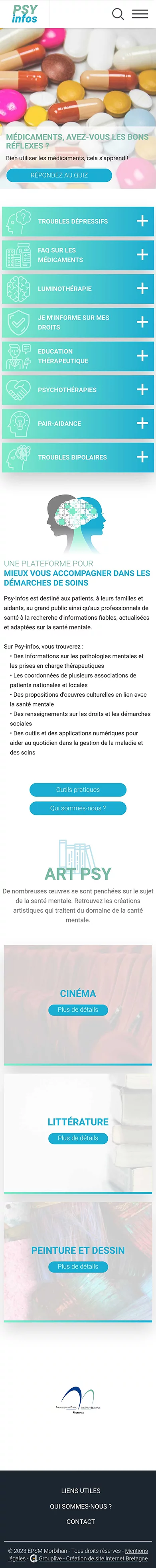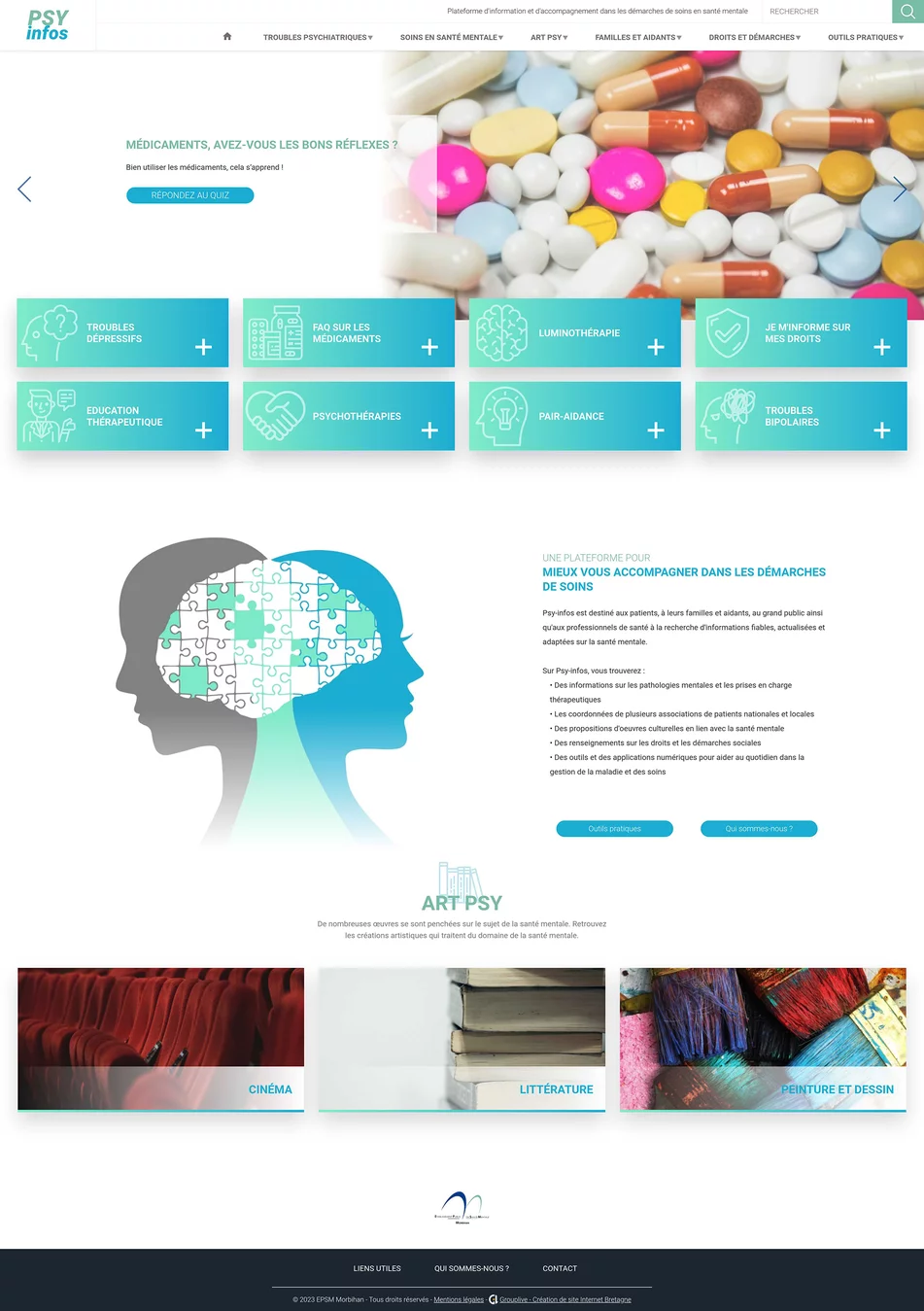 Chez Grouplive, nous croyons en la puissance de la technologie pour améliorer la vie des gens, et cela se reflète dans nos projets. L'un de nos projets les plus récents et les plus significatifs est la création du site Internet Psy-Infos pour l'EPSM du Morbihan. Ce site a été spécialement conçu pour fournir des informations fiables, actualisées et adaptées sur la santé mentale. Il s'adresse aux patients, à leurs familles, aux aidants, au grand public et aux professionnels de la santé qui recherchent des ressources essentielles dans le domaine de la santé mentale.