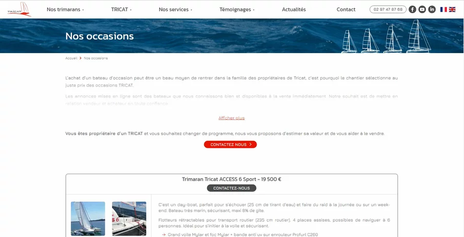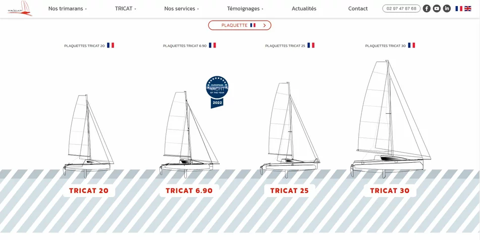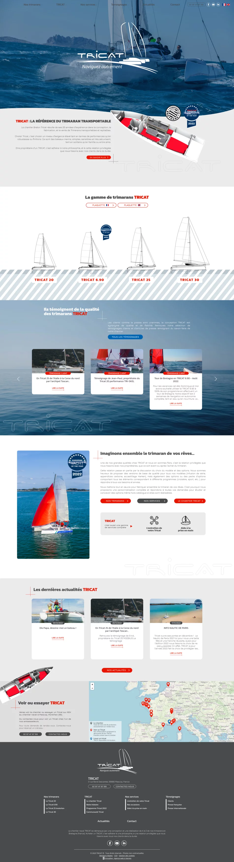 Pour accompagner Tricat dans son aventure, Grouplive a choisi de concevoir leur nouveau site avec le CMS Drupal. Ce dernier permet de présenter l'établissement grâce à des descriptions et photographies. Une partie du site est également dédiée à la présentation des gammes de bateau, tout en mettant en valeur les aspects techniques.