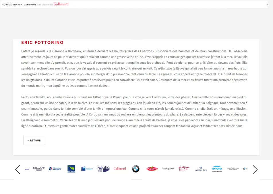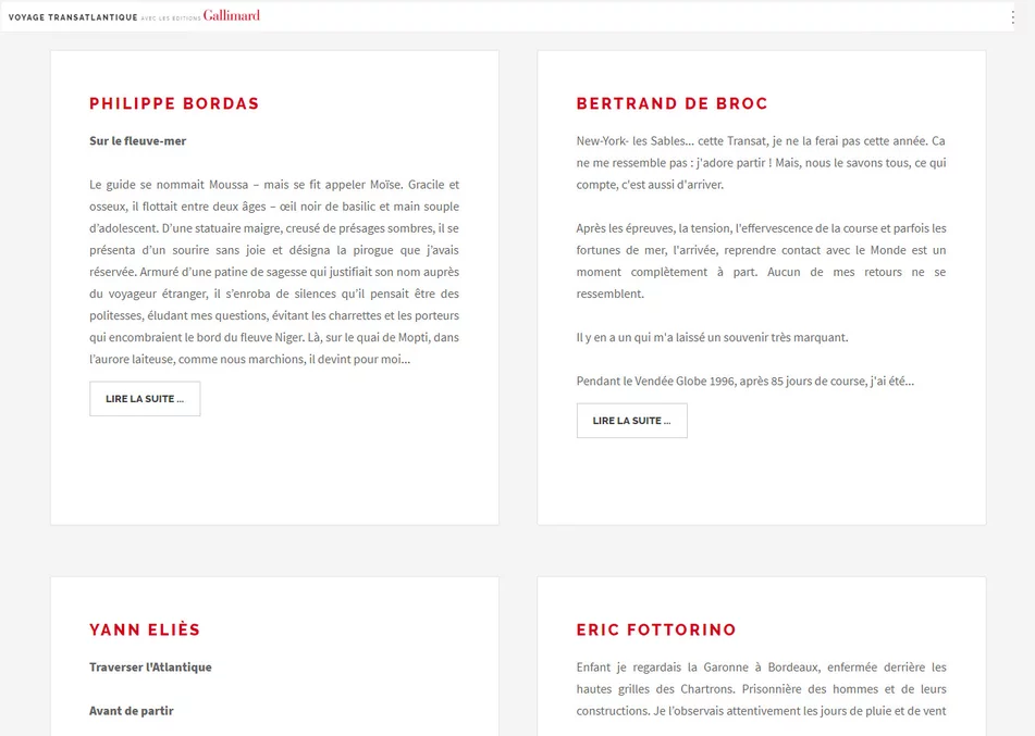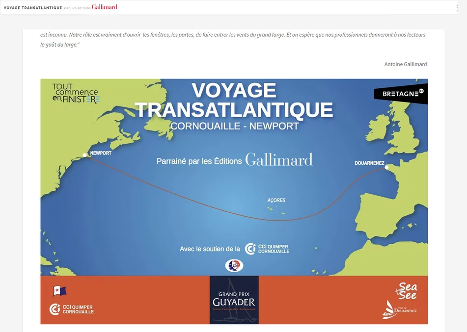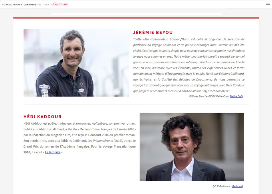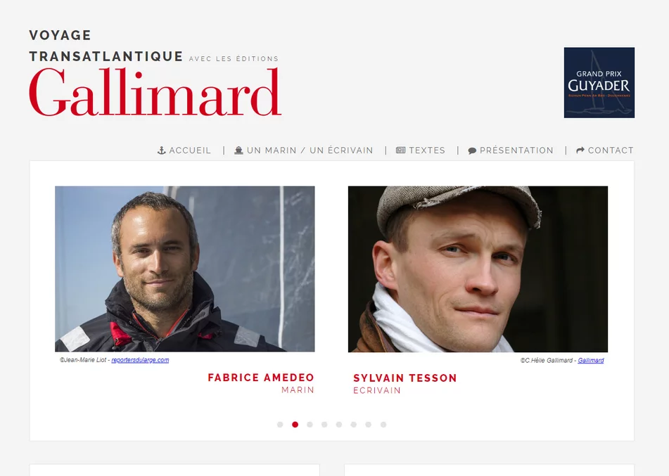 Le Voyage Transatlantique avec les éditions Gallimard est une aventure à la fois nautique et culturelle. Ce projet rassemble 8 skippers et 8 écrivains Gallimard, qui à travers ce site internet ont eu envie de nous raconter leur transat. Caractéristiques du site Internet : Flux d'actualit...