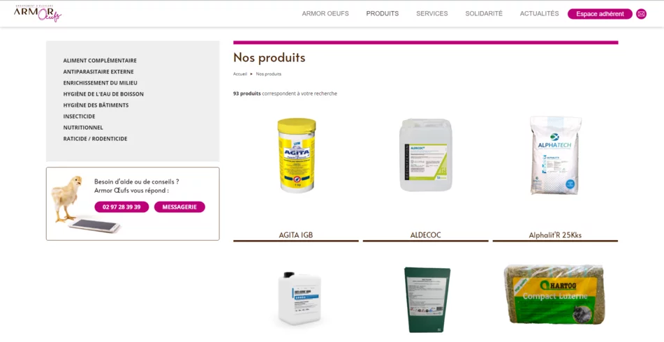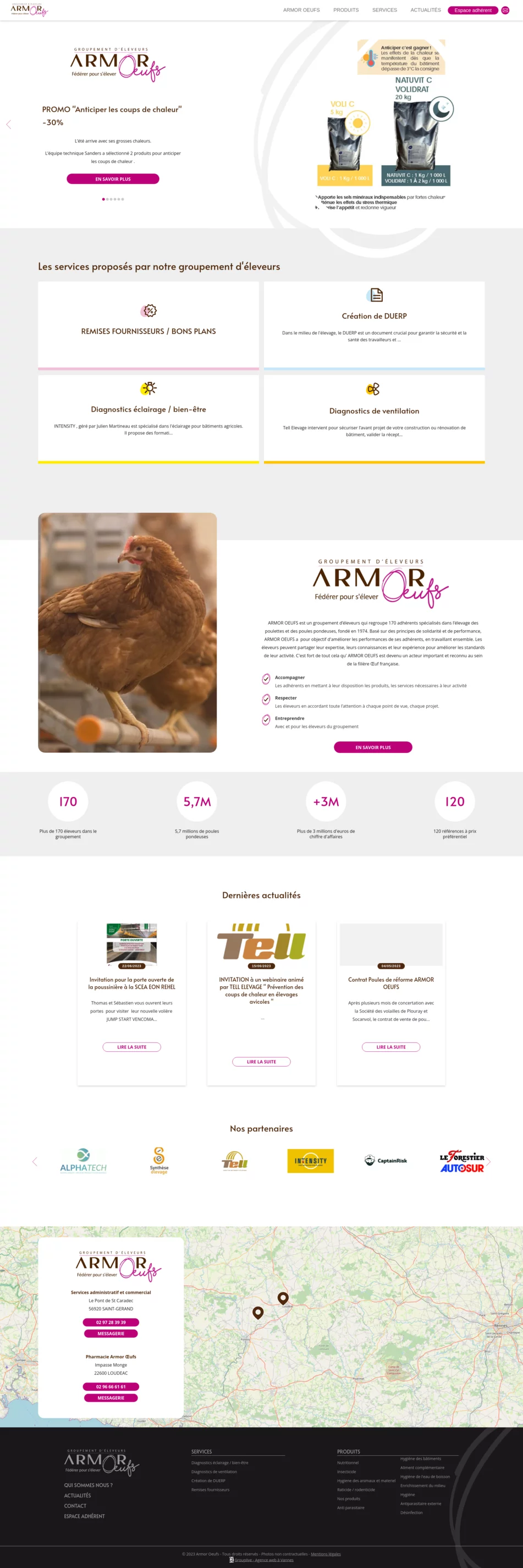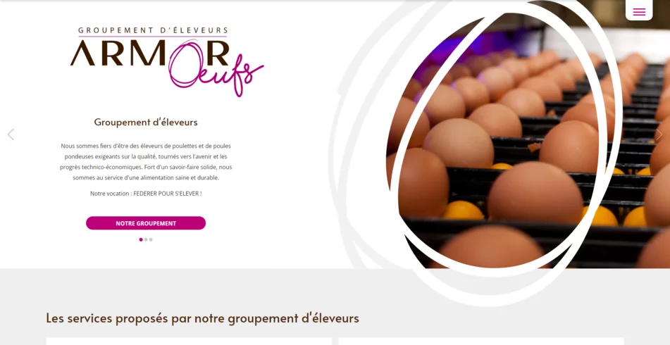 Le site web d'Armor Oeufs a été conçu et développé par les équipes de Grouplive avec le CMS Drupal. Son interface d'administration sur mesure permet à AO de facilement ajouter du contenu, des produits et des activités tout en préservant son design unique. Le site possède également une administration intuitive et une interface spécifique quand un membre de l'association est connecté. Il propose même un système de panier pour les utilisateurs connectés.