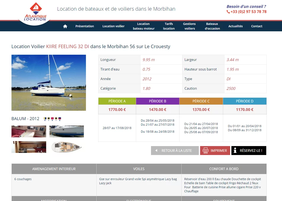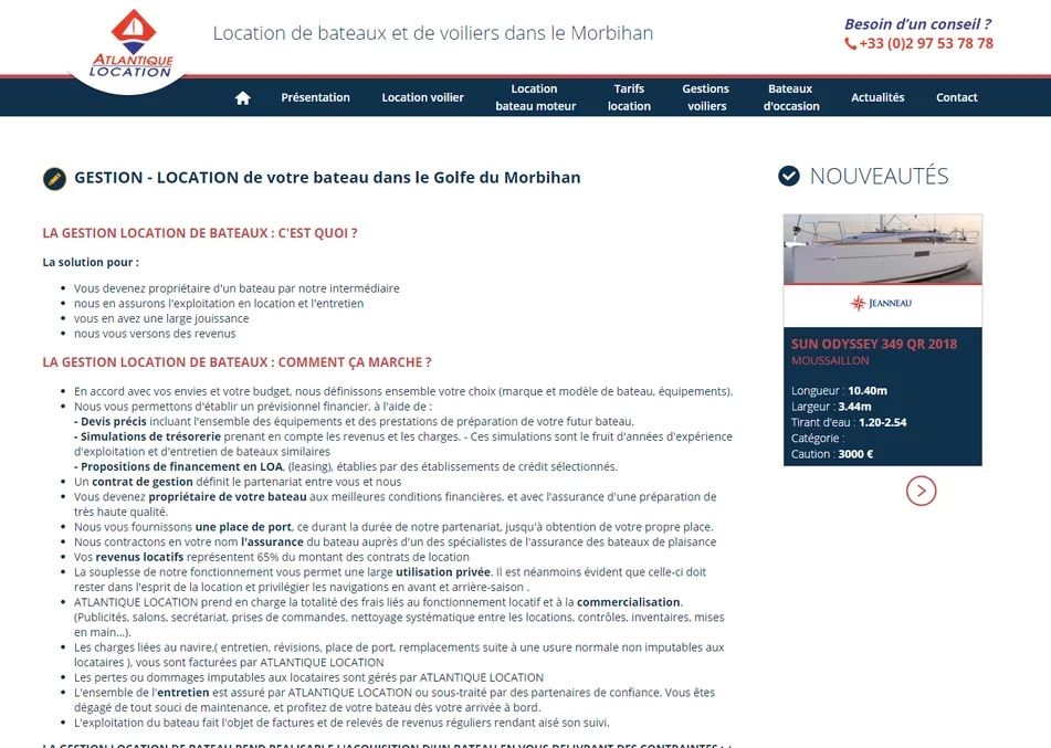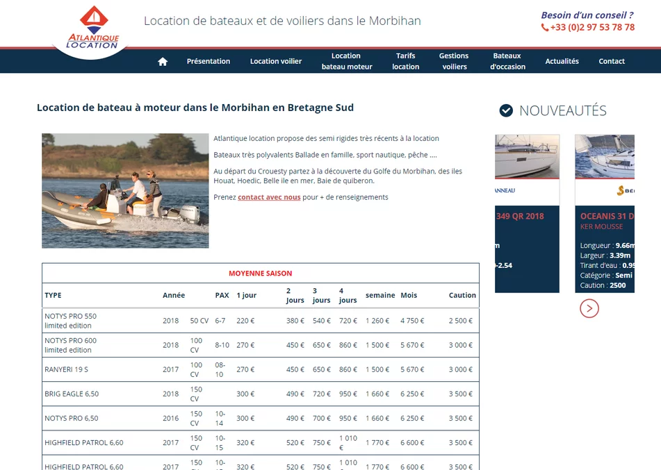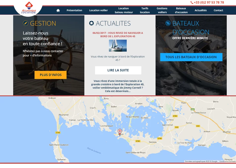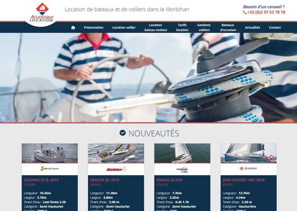 La société de location de voiliers Atlantique Location, située sur le port du Crouesty dans le Morbihan (56), a été sacrée meilleur loueur de voilier de France en 2016. Notre agence a créé le site Internet vitrine qui permet de réserver en ligne un voilier.