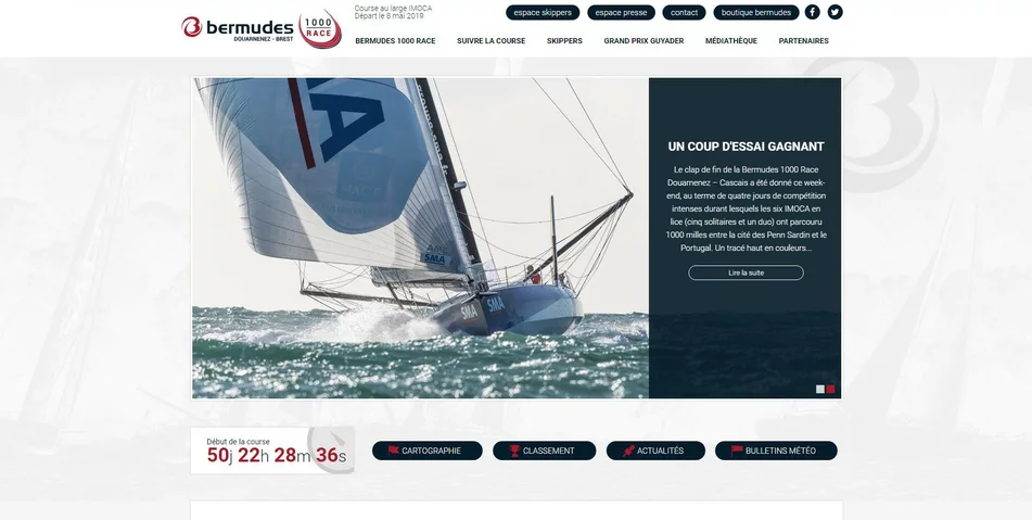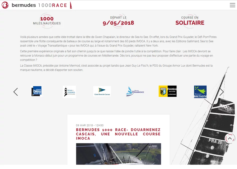 Bermudes, marque de vêtements techniques de la Bonneterie d'Armor (Armor Lux) a fait appel à notre agence web pour la réalisation du site Internet de la course au large Bermudes 1000 Race. Le site permet la consultation en direct du classement de la course via une carte interactive suivant la progression de skippers.
