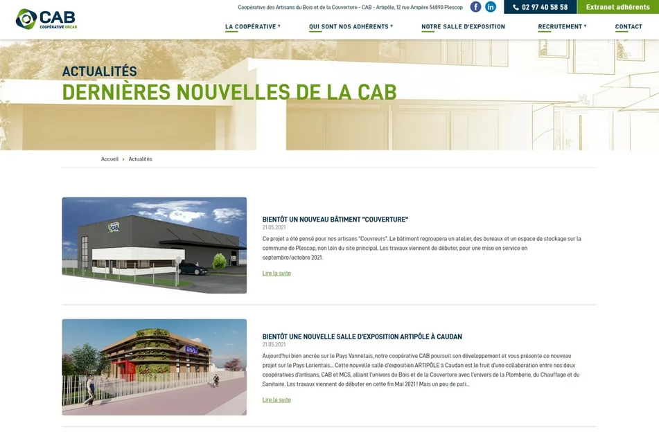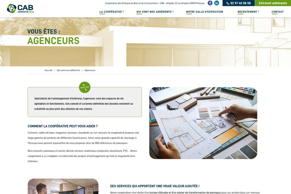 Créée en 1998, la Coopérative des Artisans du Bois et de la Couverture, abrégée en CAB56, massifie ses achats, stocke et livre des matériaux bruts et manufacturés dans les domaines du Bois et de la Couverture. Notre agence web a développé spécifiquement pour eux un site internet qui permet d...