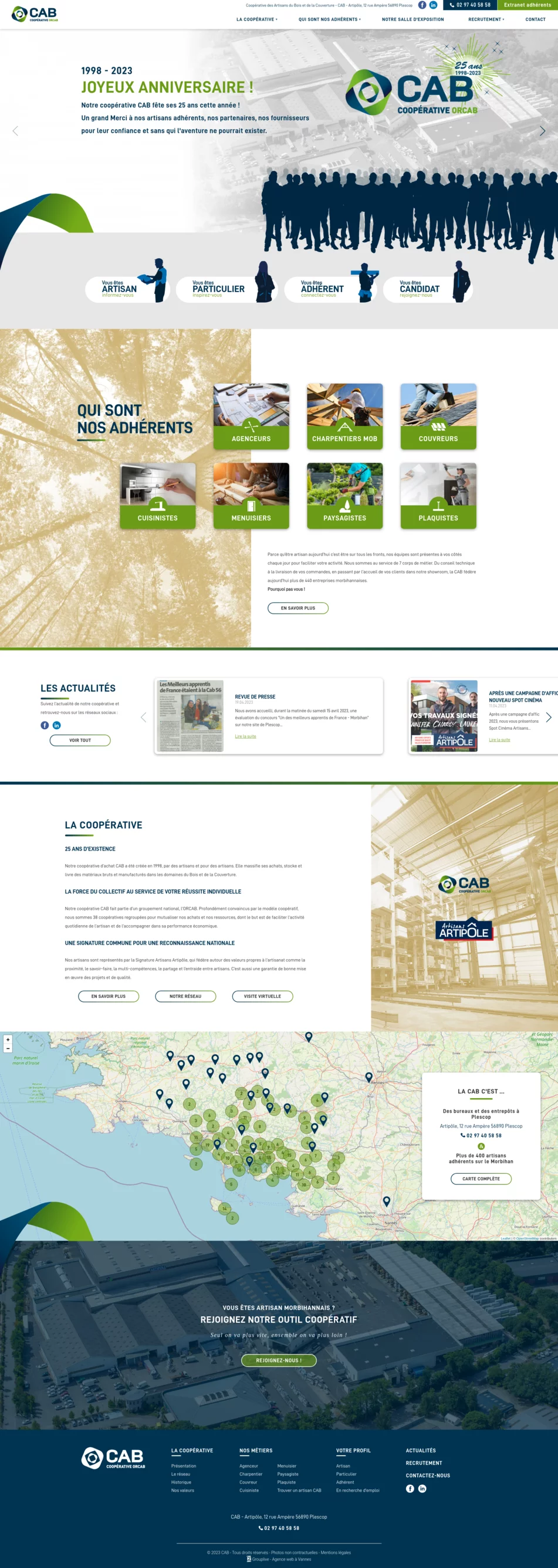 Créée en 1998, la Coopérative des Artisans du Bois et de la Couverture, abrégée en CAB56, massifie ses achats, stocke et livre des matériaux bruts et manufacturés dans les domaines du Bois et de la Couverture. Notre agence web a développé spécifiquement pour eux un site internet qui permet de présenter leur coopérative ainsi que le réseau ORCAB et la marque Artisans Artipôle qui y sont intrinsèquement liés.