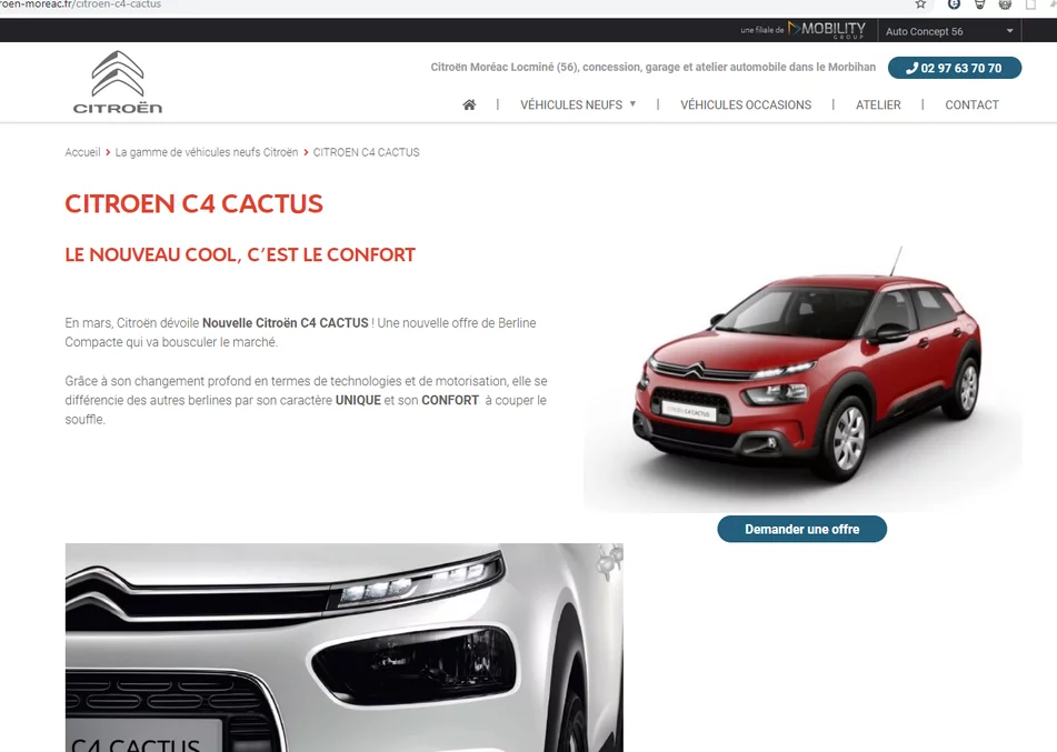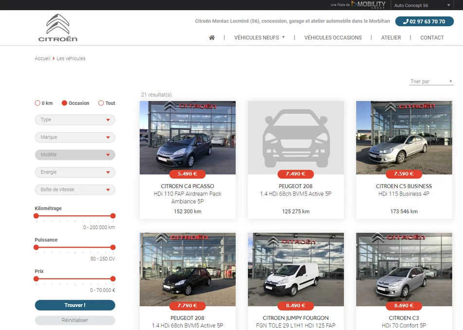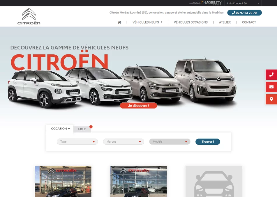 Grouplive a crée le site Internet de la concession Citroën à Moréac dans le Morbihan (56). Ce site Internet permet de réserver un véhicule neuf ou d'occasion. Notre agence web a développé un module web qui permet de communiquer avec l'outil CRM de la concession. Les stocks de véhicules sont mis à jour en direct sur le site Internet.