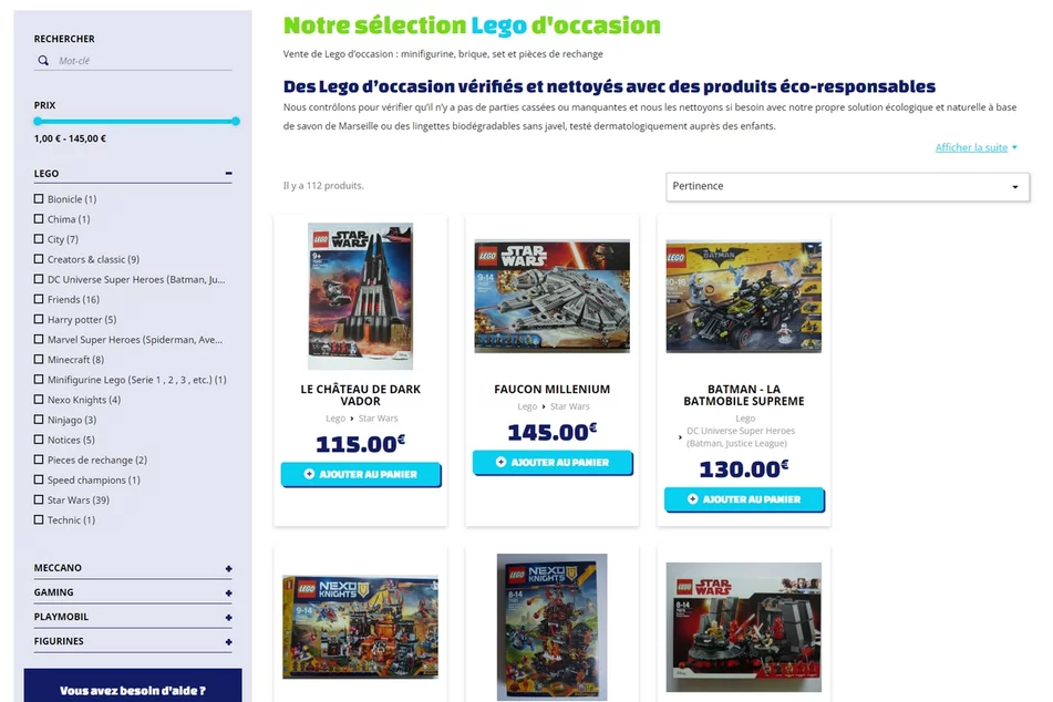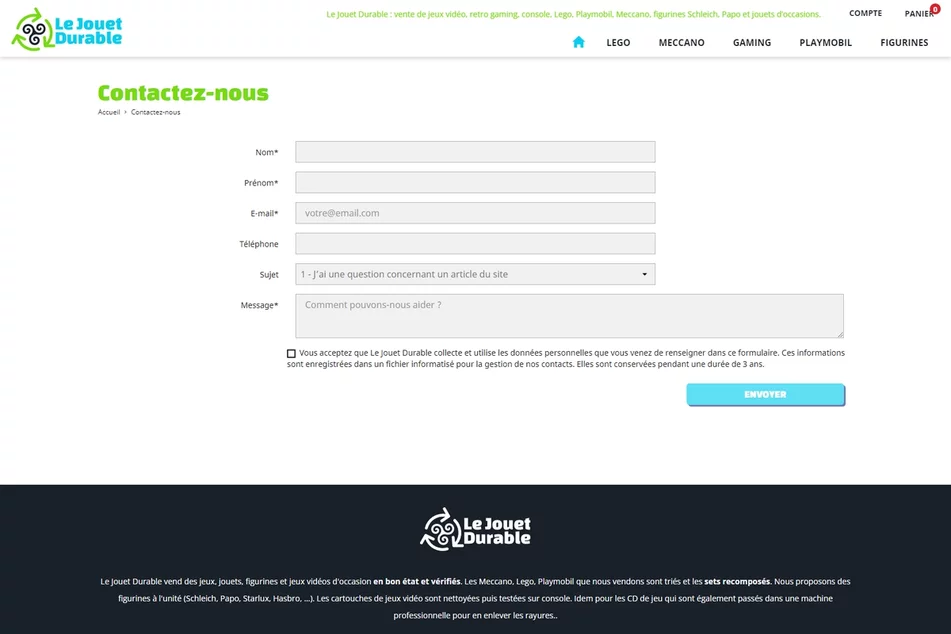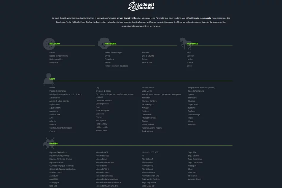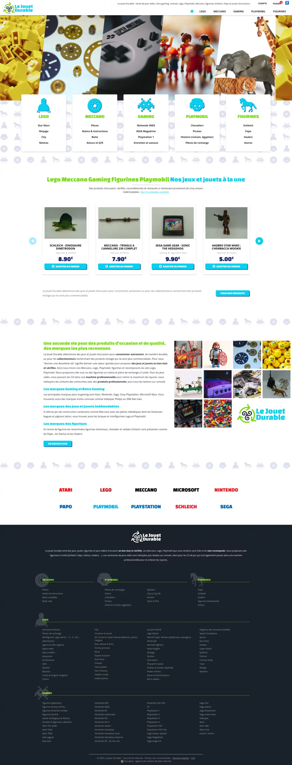 Boutique en ligne proposant des produits d'occasion, vérifiés, reconditionnés et restaurés (le cas échéant), le Jouet Durable s'inscrit dans une démarche de consommation alternative tout en permettant aux collectionneurs de rechercher des produits vintage n'étant plus commercialisés. Leur catalogue se décline en 5 univers : Lego, Meccano, gaming, Playmobil et figurines.