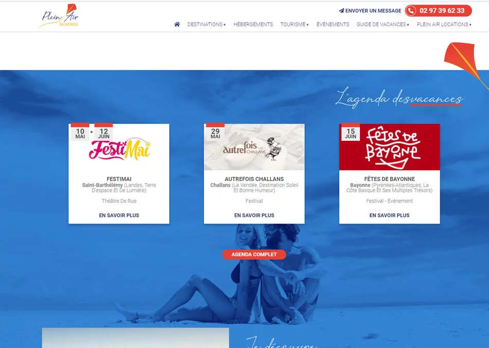 Nous avons développé une passerelle de communication avec le système de réservation CRM déjà en place qui récupère automatiquement les données pour les afficher sur le site Internet. L'agenda des événements et le catalogue des destinations permet de booster le référencement naturel et donc la présence de Plein Air Locations sur Internet.