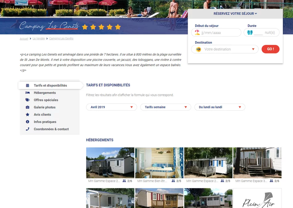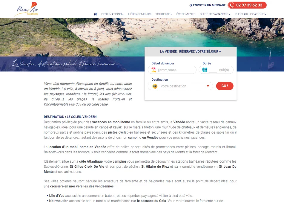 Notre agence web a développé la boutique de réservation en ligne de Plein Air Locations. Cette société propose la réservation de mobilhome dans des campings sur la côte ouest de la France (Morbihan, Vendée, Landes et Pyrénées-Atlantiques) Ce site e-commerce permet aux clients de réserver en ligne le mobilhome de leur choix parmi plusieurs destinations.