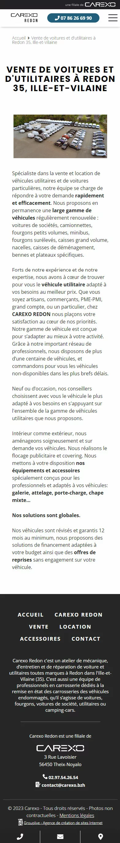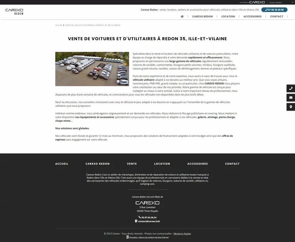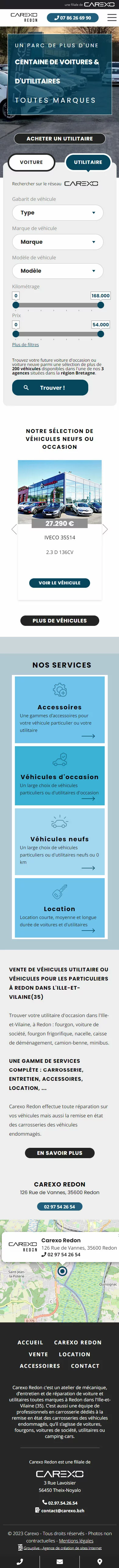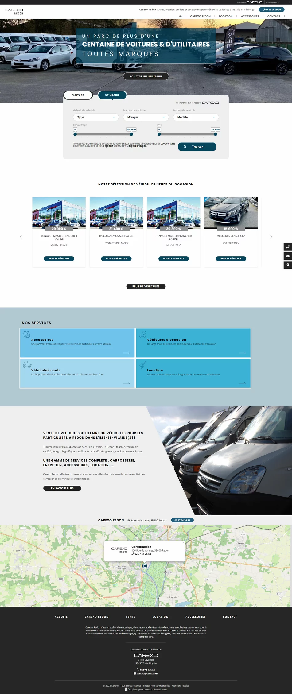Le groupe Carexo possède une antenne située à Redon (35) est spécialisé dans la vente et la location de véhicules utilitaires. Le site Internet permet de consulter les véhicules et accessoires disponibles.